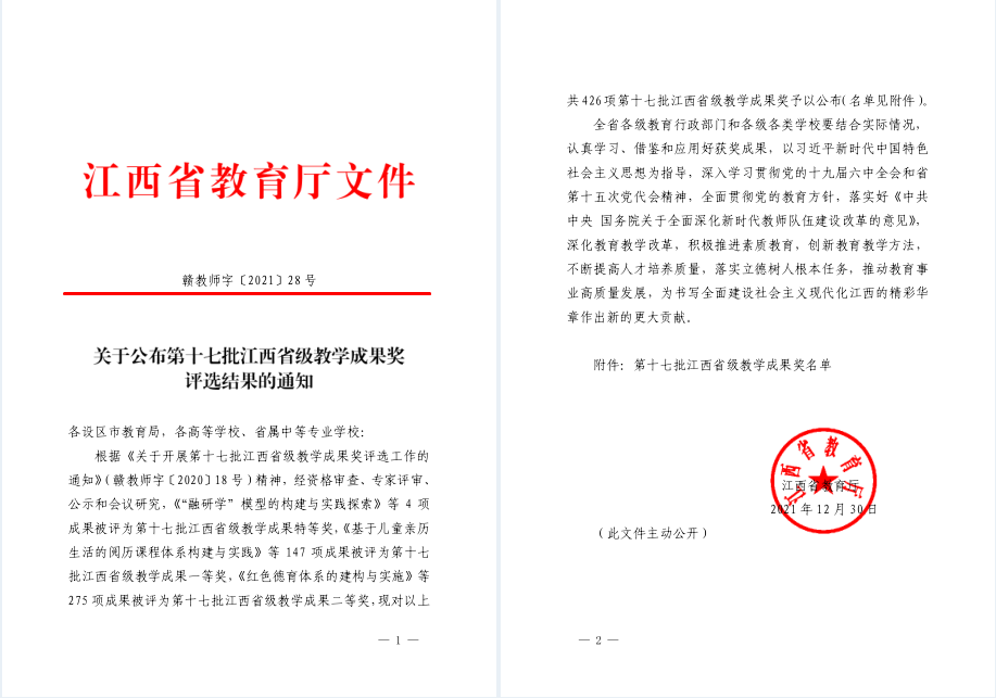 江科网讯(记者 何强江)近日,江西省教育厅发布《关于公布第十七批江西省级教学成果奖评选结果的通知》(赣教师字〔2021〕28号),公布了江西省级教学成果奖评选结果。我校共有3项成果获批省级教学成果奖二等奖,获批数量在全省民办本科高校中处于领先地位。