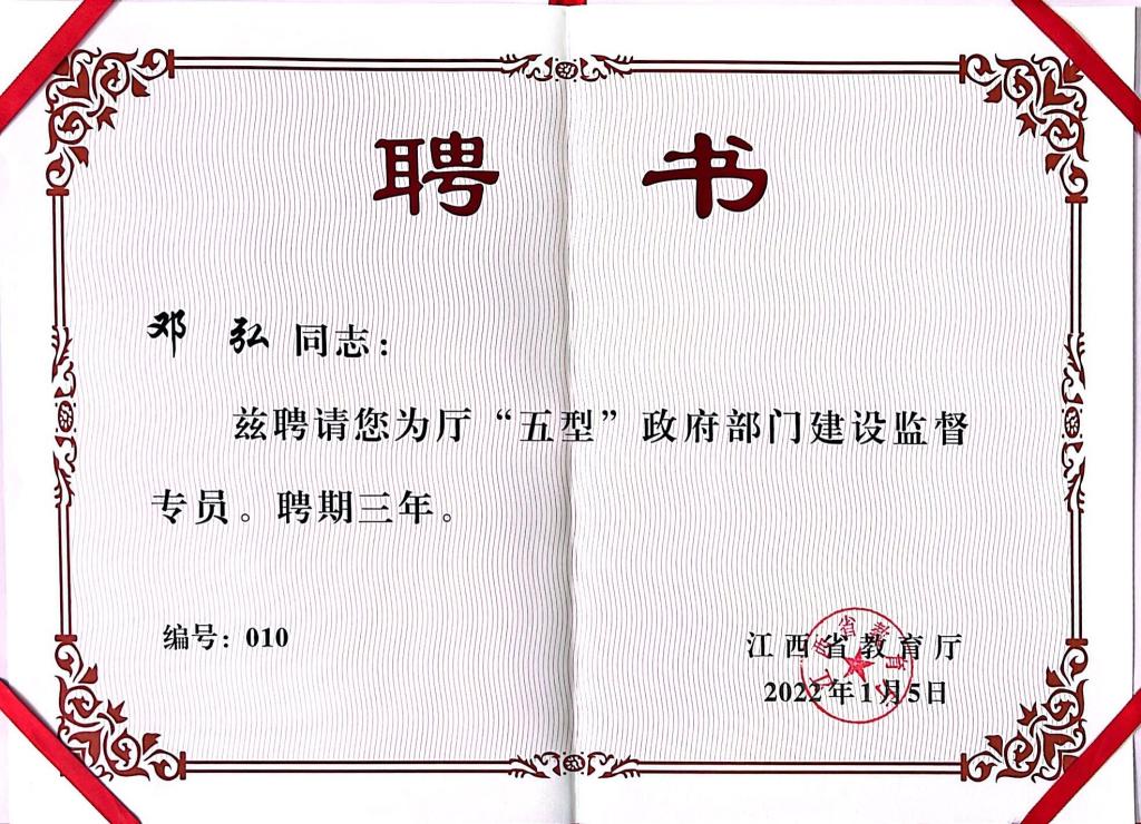 江科网讯(记者 陈佩璇 刘莹)近日,为深入贯彻落实党的十九届六中全会和习近平总书记视察江西重要讲话精神,聚焦“作示范、勇争先”目标要求,持续做好“五型”政府部门建设,省教育厅聘请100名厅“五型”政府部门建设监督专员,我校党委书记邓弘受聘其中。