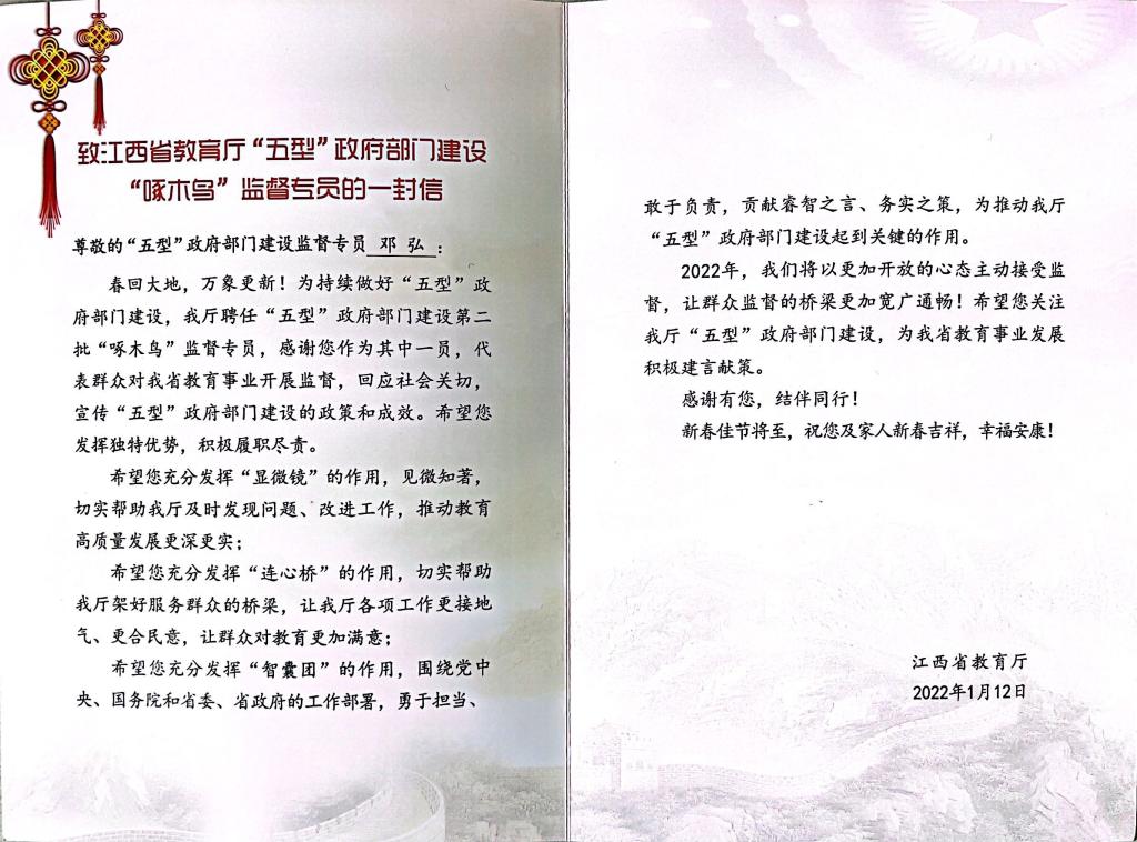 作为新聘的监督专员,邓弘书记将代表群众对我省教育事业开展监督,回应社会关切,宣传“五型”政府部门建设的政策和成效,进一步发挥“啄木鸟”作用,为积极破解难点堵点问题出谋划策,为推动江西教育高质量发展添砖加瓦。