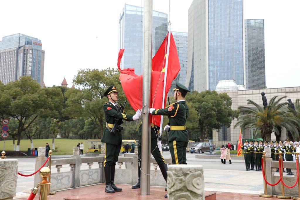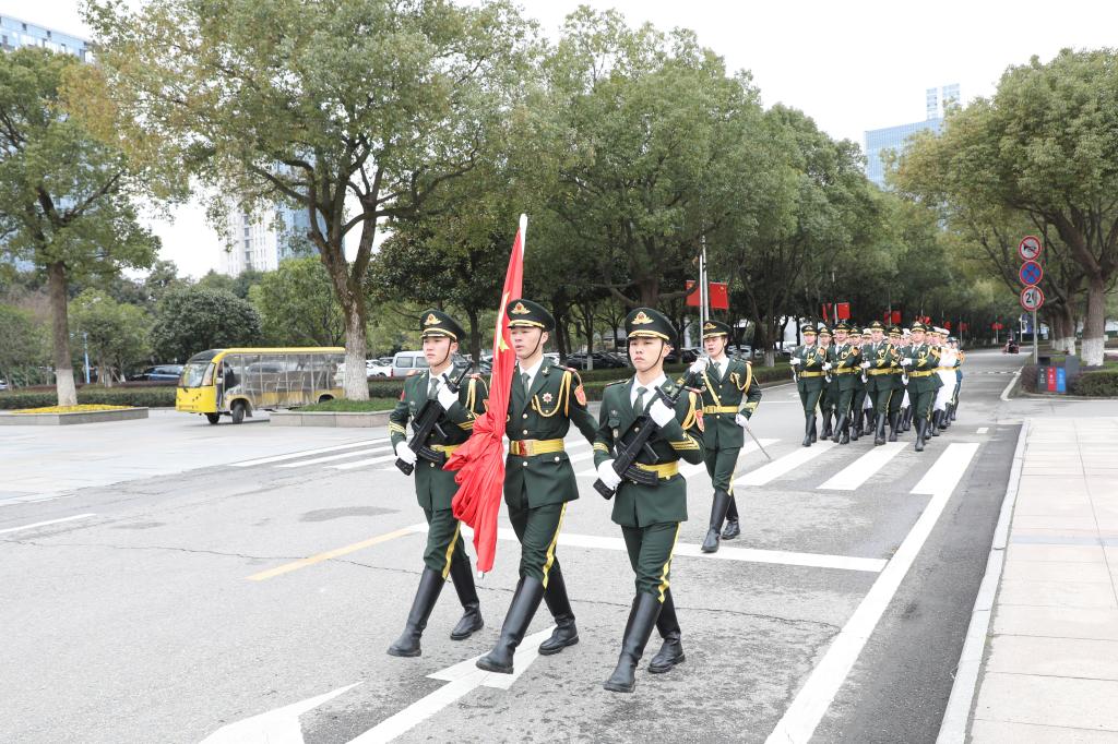 军政教导大队的旗手们身着戎装,神情庄严肃穆。他们以饱满的热情,踏着铿锵有力的礼宾步,护卫国旗行进至升旗台。伴随着《义勇军进行曲》的激昂旋律,升旗手高高扬起国旗,在场师生昂首肃立,向国旗行注目礼。鲜艳的五星红旗冉冉升起,激发了大家心中强烈的爱国热情。