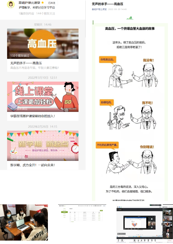 医学院第一时间通过教学动员会议商讨线上教学方式、制定线上授课实施方案和充实完善线上教学资源。基护教研室教师分工合作,将学习视频、教学教案、教学课件、作业习题、讨论题目、相关电子书籍等资料导入学习通,依托超星“一平三端智慧教学系统”学习通平台、腾讯会议和微信线上辅导开展线上教学。为防止上课期间在线教学平台出现问题,各教师均准备两套教学方案,以备出现问题时能够快速转换,继续完成教学任务。为提高学生线上学习的兴趣与成效,成立学生课程助教组与运维组,让部分学习能力强、沟通表达能力较好且具备一定实操能力的学生参与课程管理,充分发挥学生的主体精神;通过与学生在线座谈反馈和在线教师授课反思,针对授课过程中出现的问题及时进行总结,在下次课进行及时调整改进。