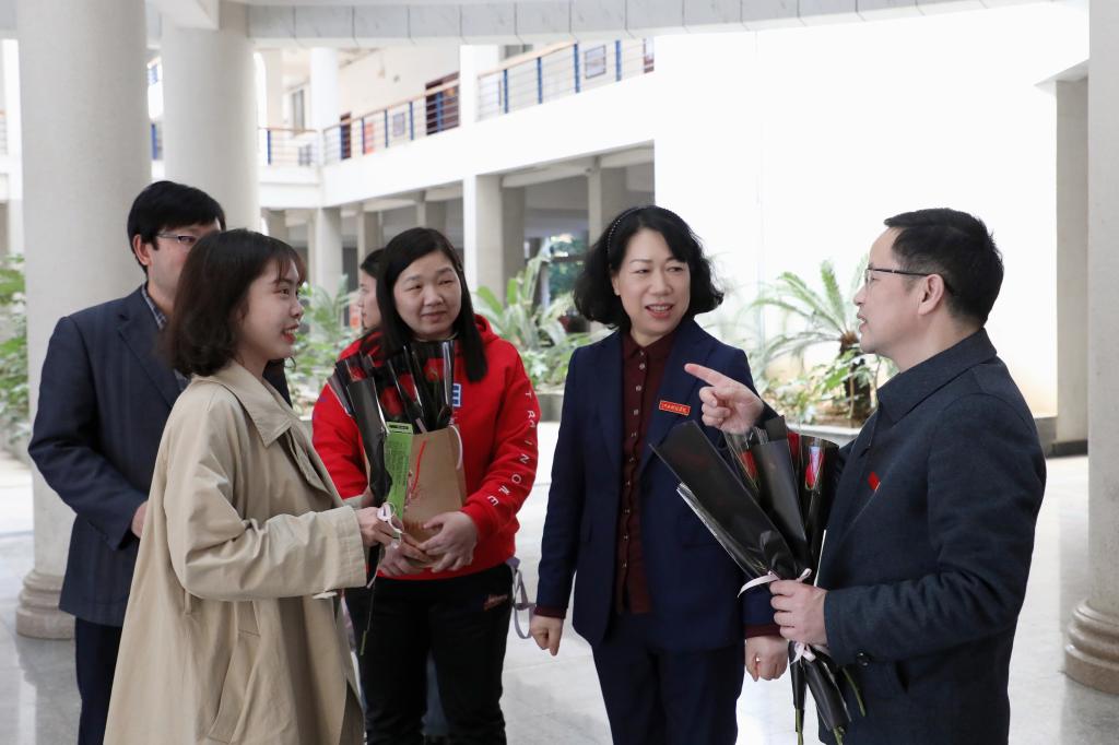 邓弘书记、林素君副校长一行先后走访慰问管理学院、图书馆、32栋学生宿舍、招就处、督导处、校(党)办在岗女职工。“女神节快乐!我们代表学校董事会、党委、行政来看望你们,感谢你们‘半边天’的力量!”校领导向坚守岗位的女教职工致以亲切的节日问候,并对她们一直以来以主人翁的姿态参与学校建设和发展以及所作的重要贡献表示衷心感谢,并希望大家在今后的工作中再接再厉,取得更好的成绩,为学校争光添彩。