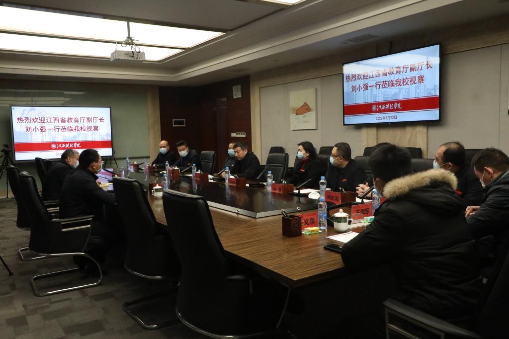 江科网讯(记者 刘莹 陈佩璇)3月22日上午,省教育厅副厅长刘小强、高教处(科技处)处长肖德征一行来校检查指导疫情防控工作。我校董事长于果,校长张海涛,副校长闵桂林、马勇、周冰冰及相关职能部门负责人陪同检查。双方在行政南一楼第三会议室座谈。