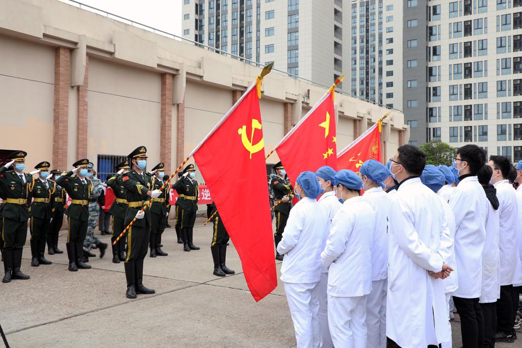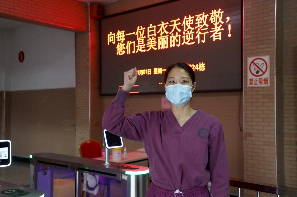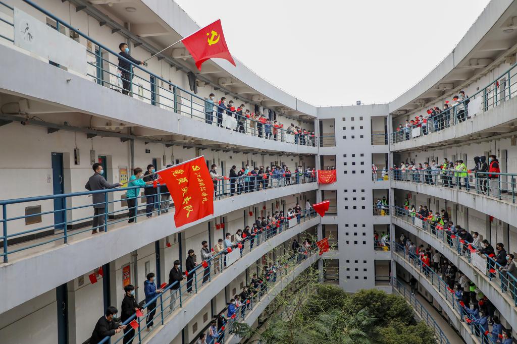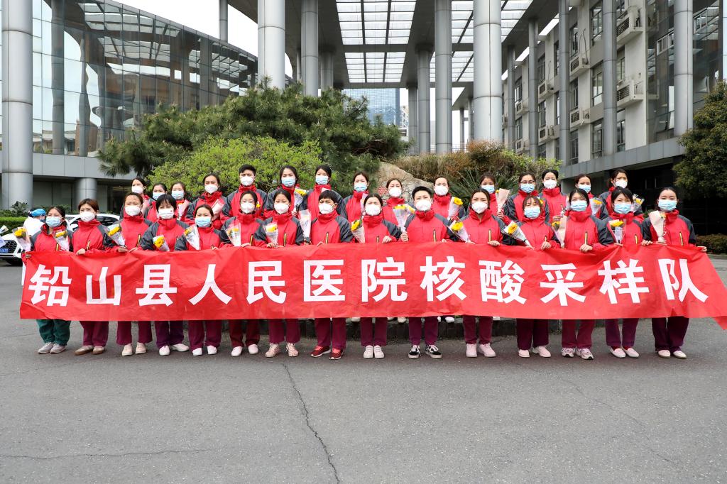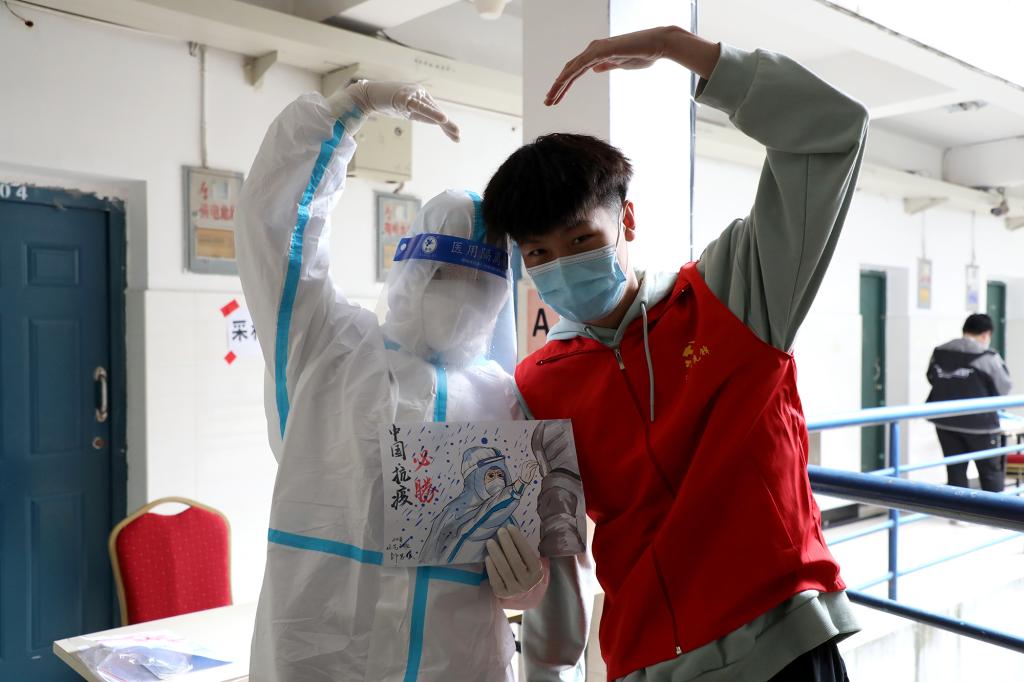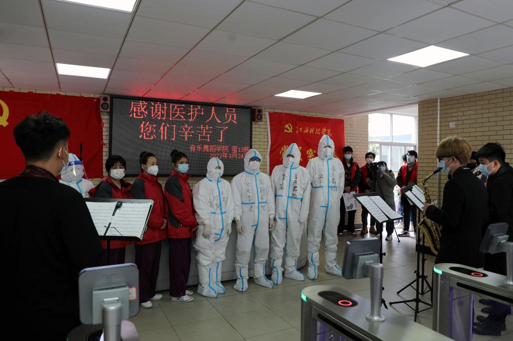 “五星红旗迎风飘扬,胜利歌声多么响亮……”9时30分,惟学楼内响起了嘹亮的歌声,同学们用一段《歌唱祖国》表达对团结一心的全体江科人、对无私奉献的医护人员的深深敬意。在鸿志楼内,核酸检测工作结束后,音乐舞蹈学院同学为医护人员带来器乐五重奏,用音乐声舒缓白衣天使和全体疫情防控工作者的身体疲惫。