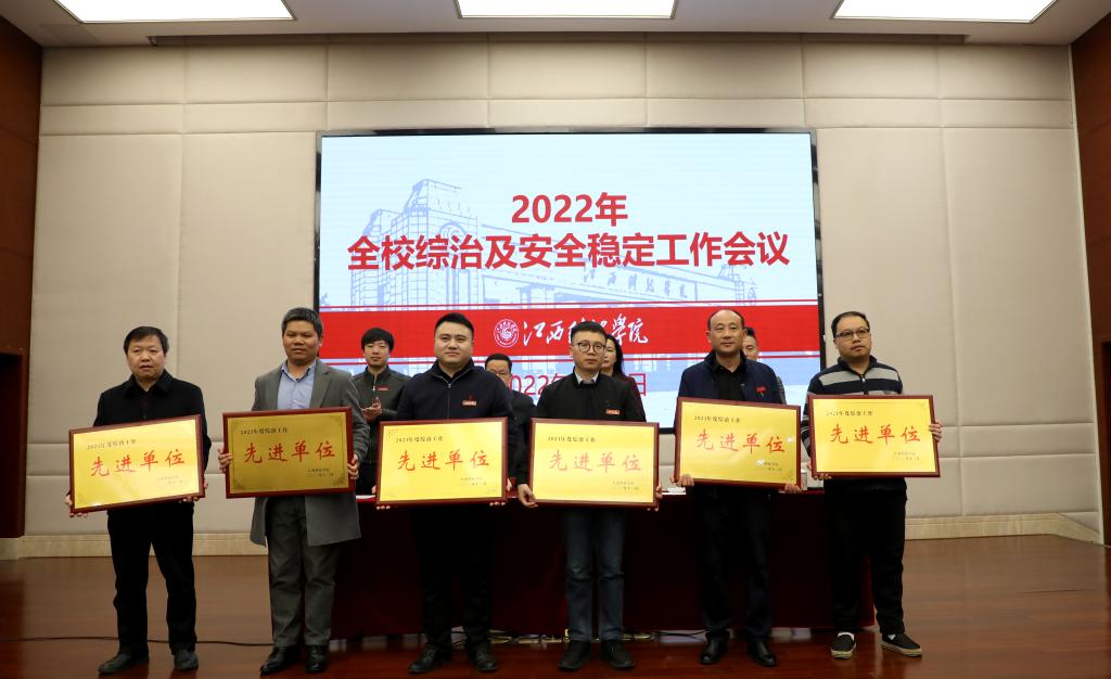 李玮副校长宣读《江西科技学院关于表彰2021年度综治工作先进单位及先进个人的决定》,周冰冰副校长总结2021年综治、安全稳定工作并部署2022年工作任务。校领导为综治先进单位颁发奖牌。校属各二级单位负责人在会上同时签订2022年《综治及安全稳定责任书》和《消防安全责任书》。