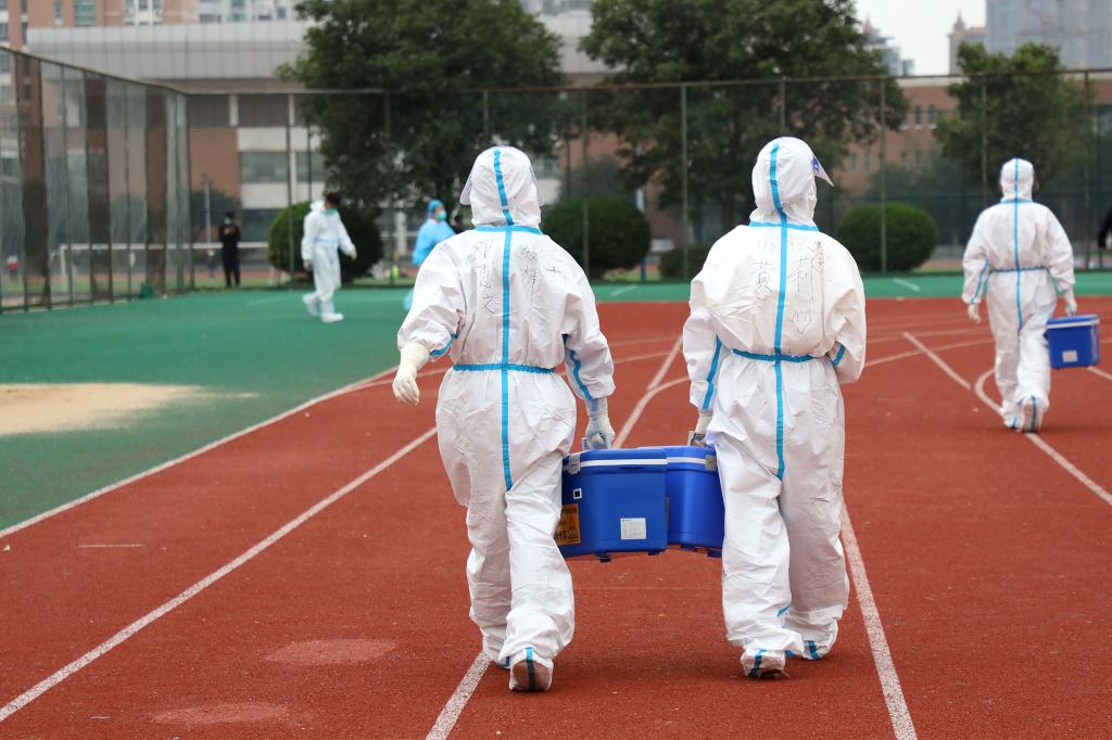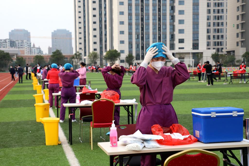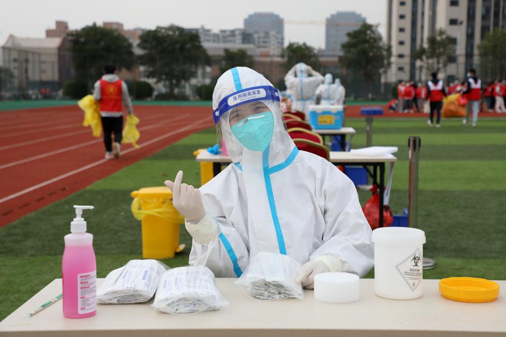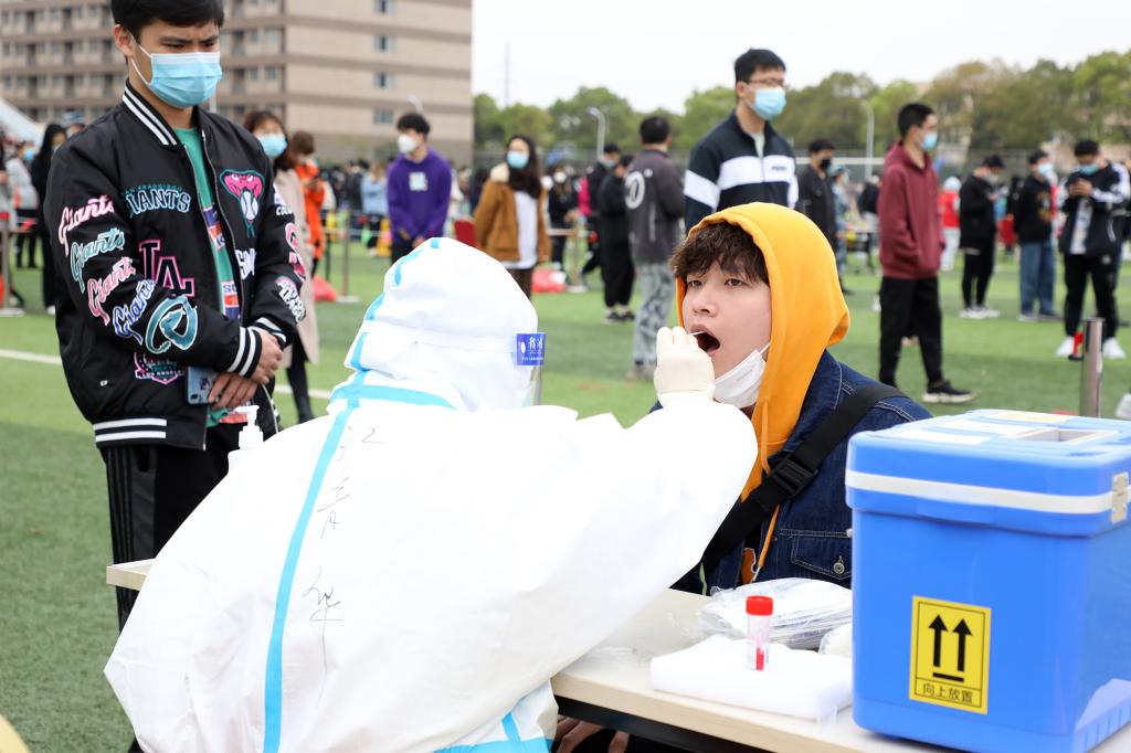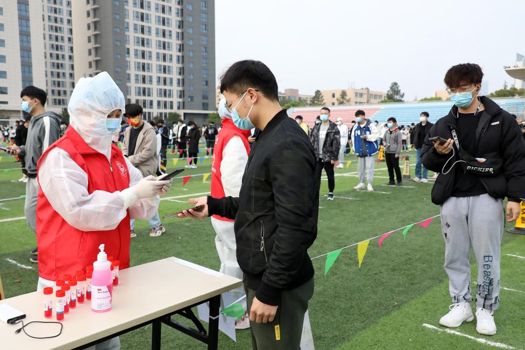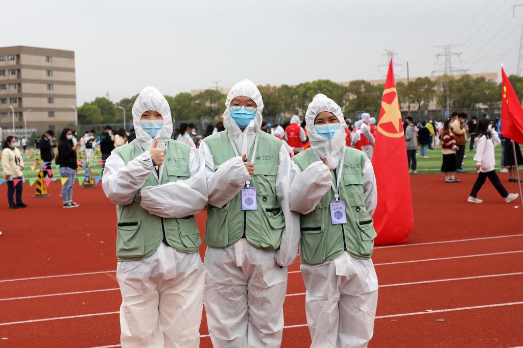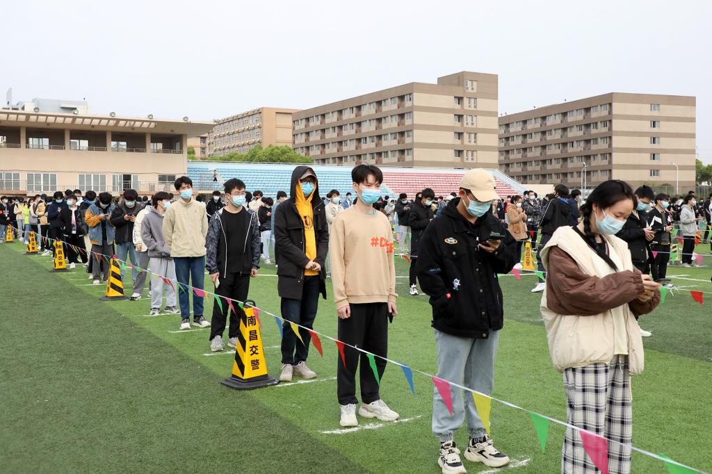 “请佩戴好口罩保持一米间隔”“请打开昌通码,完成扫码登记”“采样完请立即离开现场”……叮嘱声不绝于耳,提醒着进行采样的人员。在全校各核酸检测点,穿着密闭防护服的“白衣天使”在辛勤采样;默默奉献的志愿者在协助登记信息、扫码录入、维护秩序等。整个检测流程从采样到离场都秩序井然。