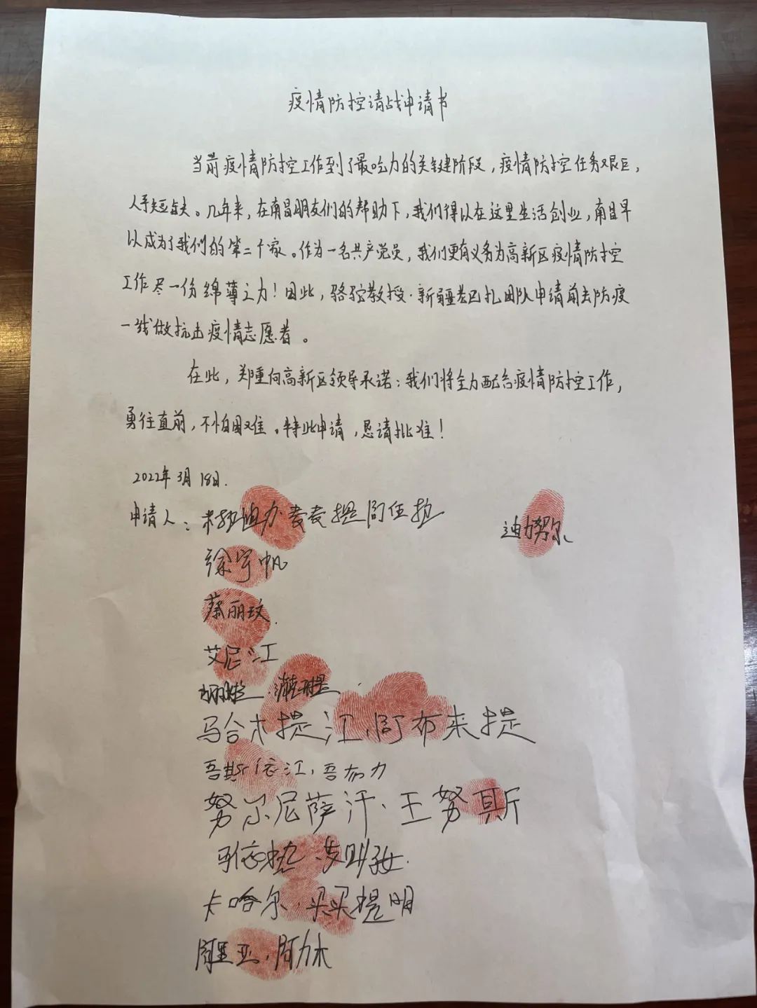 ↑米拉迪力和团队成员写下疫情防控请战申请书。(受访者供图)