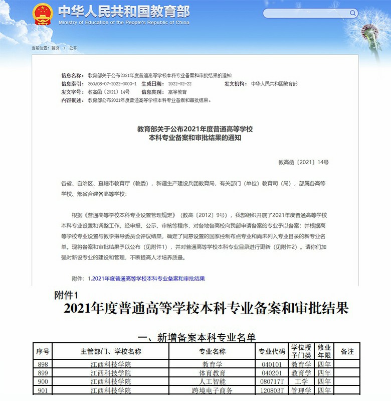 江科网讯(记者 何强江)近日,教育部发布《教育部关于公布2021年度普通高等学校本科专业备案和审批结果的通知》(教高函〔2021〕14号),我校教育学、体育教育、人工智能、跨境电子商务等4个本科专业获备案审批,2022年开始招生。
