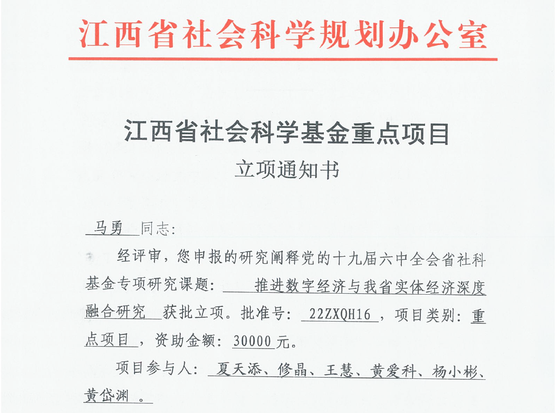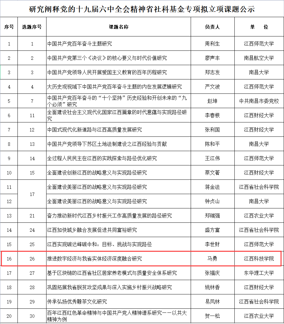 江科网讯(通讯员 汪洪琳)日前,根据江西省社会科学规划办公布的“研究阐释党的十九届六中全会精神”省社科基金专项立项课题名单获悉,我校马勇副校长申报的《推进数字经济与我省实体经济深度融合研究》课题获批立项(批准号:22ZXQH16),资助金额3万元。学校是唯一获批立项的民办本科高校。
