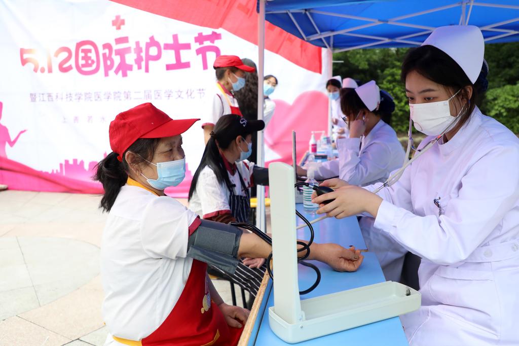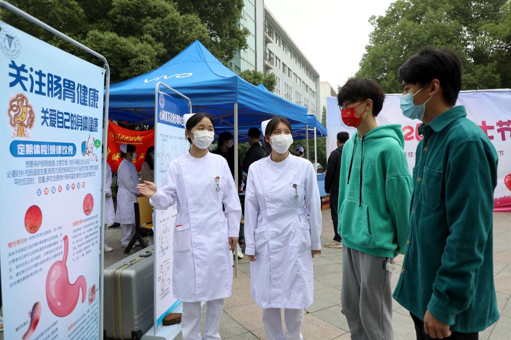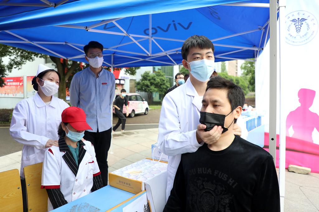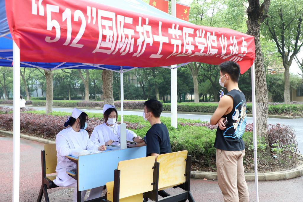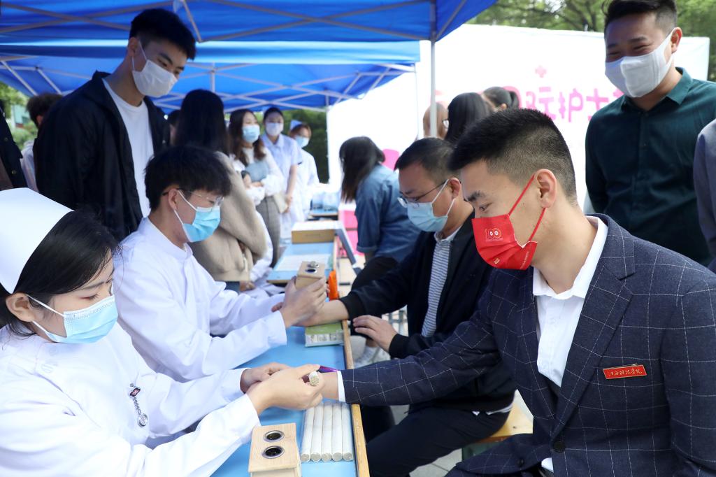 “如果遇到气道被异物堵塞,无法自行咳出时,我们可以利用海姆立克急救法进行急救……”医学院的同学们用通俗易懂的语言,向现场师生讲解应急救护知识。中医养生服务团的同学们则为师生提供艾灸、按摩等服务,传播刮痧、拔罐等传统优秀中医药文化。据了解,本次活动在生活园区设置了16个义诊点位,分布在各宿舍楼群间,给师生、教工家属和餐饮工作人员免费量血压、测血糖,发放定制口罩,普及医学常识和健康知识。“我虽然年轻,但经常熬夜、饮食不规律,身体肯定是受影响的。今天参加活动收获很大,老师给了我很多健康生活的建议。”城市建设学院学生谢咏永高兴地说。此外,药学、助产知识小问答游戏、“口罩上的青春”绘画评选、基础护理操作教学、同屏重温南丁格尔誓言等线上活动也受到师生一致好评。