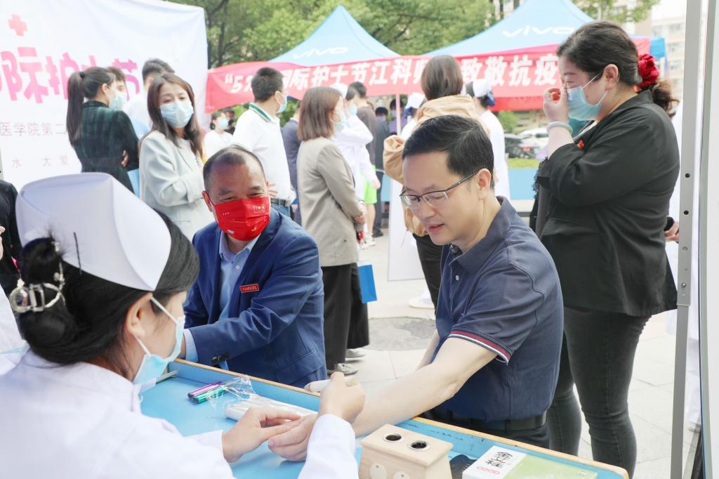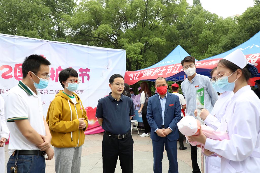 校党委书记邓弘,校党委副书记、副校长闵桂林也来到活动现场,向医学院的“准”护士代表们致以节日的亲切问候,勉励大家铭记初心,牢记习近平总书记“把人民群众生命安全和身体健康放在第一位”的殷殷嘱托,在青春的赛道上奋力奔跑,为国家卫生健康事业的发展贡献青春力量。校领导还饶有兴致地签名留影、学习心肺复苏法、体验艾灸、测量血糖等,对同学们扎实的理论功底和娴熟的手法技巧赞赏有加。
