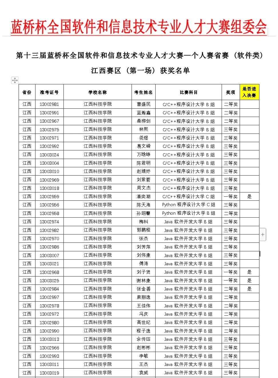 江科网讯(通讯员 曾丛)日前,第十三届“蓝桥杯”全国软件和信息技术专业人才大赛(江西赛区)结果出炉。我校信息工程学院积极组织学生参赛,最终取得了一等奖3项、二等奖13项、三等奖31项的优异成绩。其中,获省一等奖的3名同学将代表学校参加第十三届蓝桥杯全国总决赛。