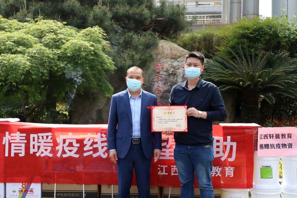 江科网讯(记者 何强江)4月20日下午,我校2010届校友、江西轩晨教育科技集团创始人张晓峰,在疫情防控的关键时期主动返校捐赠消毒液20桶、口罩5箱、84消毒液10箱等抗疫物资。