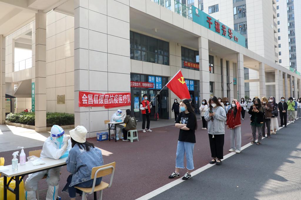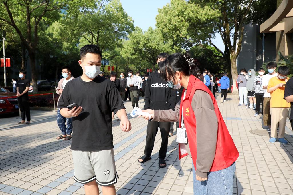 七轮核酸采样都在宿舍外空旷处进行,检测现场严格落实疫情防控要求,全体师生戴口罩间隔2米,分时段、分批次,有序进行咽拭子采集。党员突击队和学生志愿者在现场协助开展秩序维护等志愿服务工作,全体人员积极配合、秩序井然,整个检测流程从采样到离场,组织科学、保障有力、防护到位。