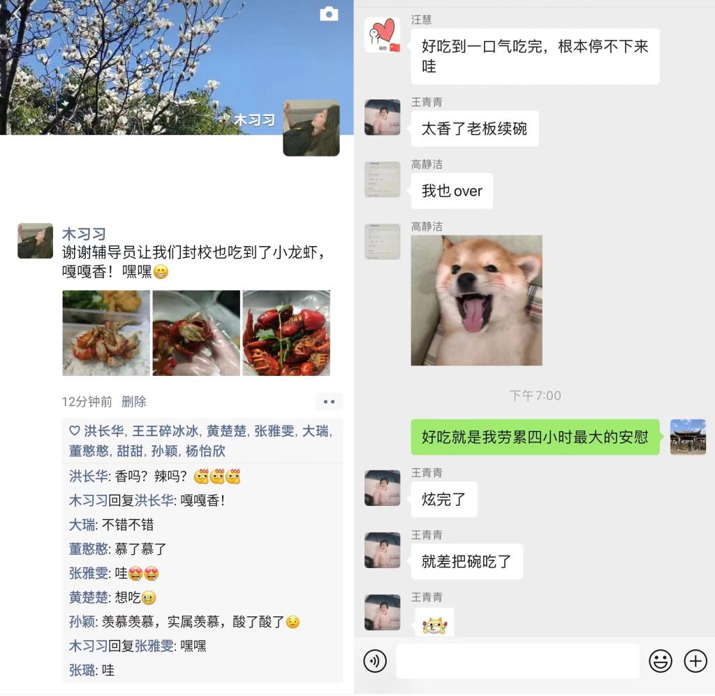 “前些天班上学生在网上看到一段辅导员给学生送小龙虾的视频,然后就在评论区@我。当时我就想,别人家学生有的,我的学生也不能少。”谈及给学生做小龙虾的原因,周磊坦言:“我家在江苏盱眙,小龙虾是当地的一个产业,自己也经常做小龙虾吃。这次受疫情影响,学校实行封控管理,学生也许久没回过家和家人团聚。作为辅导员,希望可以尽自己所能关心学生。刚好学生提出了这个‘要求’,我就想着满足一下大家。”“谢谢辅导员让我们封校也吃到了小龙虾,嘎嘎香,嘿嘿~”“我终于也成了别人羡慕的学生!”同学们在朋友圈直呼有这样的辅导员很幸福。