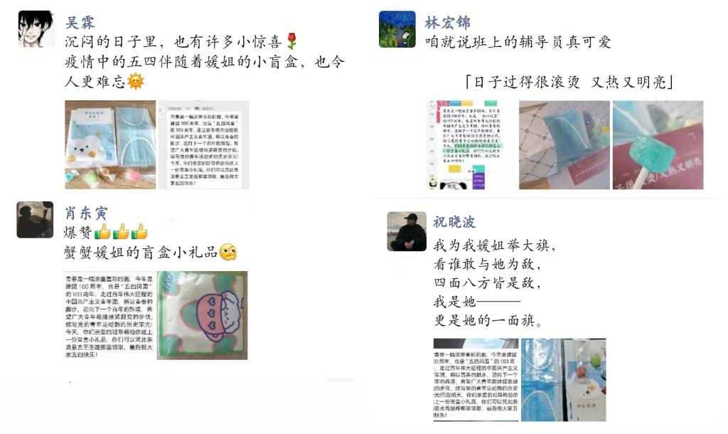 江科网讯(记者 何强江)“疫情之下,我们的生活有些许单调,能够在五四青年节这天收到媛姐的小礼物,确实给我们平淡的生活增添了许多欢乐。”“今年过了一个特别的五四青年节,在媛姐送的‘五四’盲盒里,我拆到了口罩、糖果和钥匙扣。”5月4日,江西科技学院城市建设学院不少学生在微信朋友圈中分享自己的喜悦。