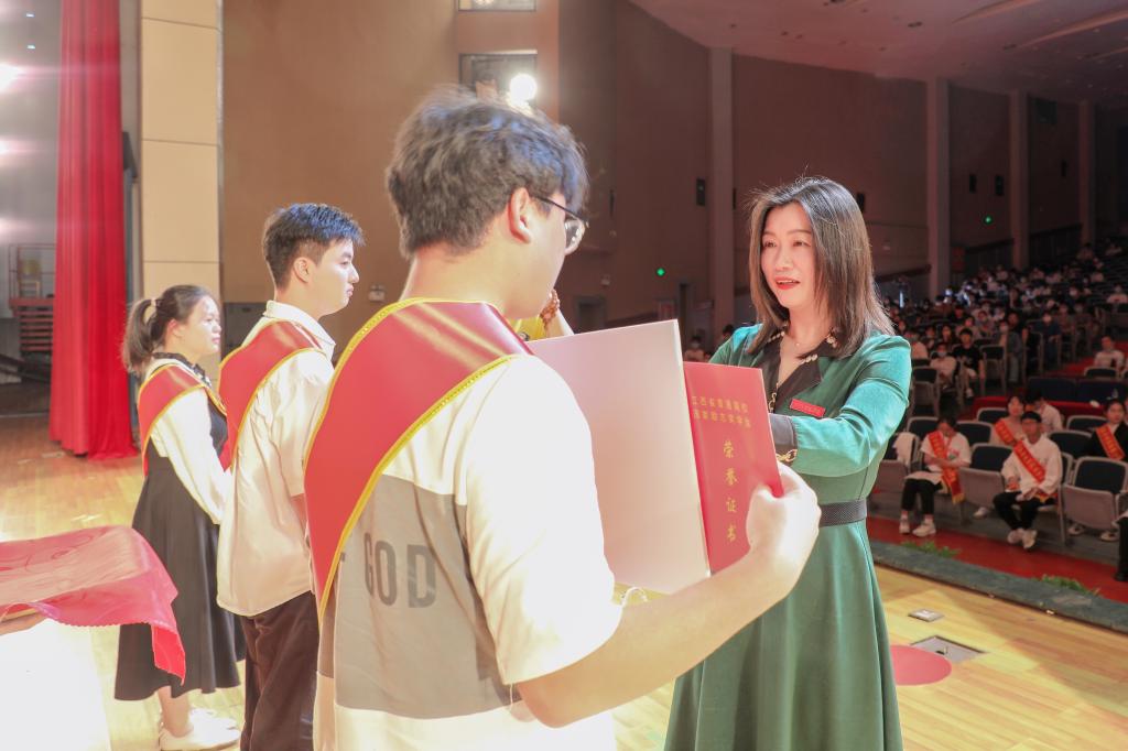 张海涛校长对同学们提出四点期望。一是坚定信念,志存高远。要自觉把个人的发展融入到党和人民的事业中去,把对远大理想的向往与追求转化为实实在在的行动,向阳而生,以阳光的心态迎着光、凝聚光、成为光。二是修身明德,健康体魄。要在不断提高自身专业素养的同时,注重自身道德情操的陶冶,坚持加强体育锻炼,培养良好的行为习惯和生活习惯,人人都有精气神,个个充满正能量。三是求真务实,刻苦钻研。要珍惜青春年华,把学习当成一种习惯、一种追求、一种向往,始终保持强烈的求知欲和旺盛的学习欲,自觉学习、自主学习,不断开阔视野,不断从书本上学、从实践中学,向榜样学、向先进学,既学知识又学文化、既学经验又学技术、既学做人又学处事。四是励志前行,心存感恩。要珍惜来之不易的荣誉,常怀感恩之心,以实际行动报答父母、感恩母校、回馈社会,同时把荣誉作为奋斗的动力,坚持不懈,百折不挠,通过不断努力成就更好的自我。最后,她希望全体同学立大志、成大器,登上大舞台,成就大事业。青春在磨砺中出彩,人生在奋斗中升华。