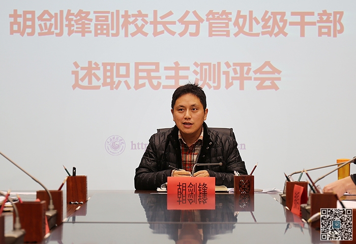 会上,胡剑锋通报了教学单位年度教学工作排名情况和所分管单位科级及科级以下教职工年终考评情况,并与全体与会人员共同进行审议,对处级干部年终述职民主测评进行了布置和说明。在处级干部述职结束后,胡剑锋从统一认识、明确职责、规范管理、特色创新、展现优势和提升质量等六个方面对2016年工作进行了回顾。他要求各教学单位2017年要在2016年的基础上继续深耕细作,久久为功,进一步完善人才培养模式改革,进一步推进教学改革,进一步加强对考研的服务管理,进一步做好学校审核性评估的迎评工作。