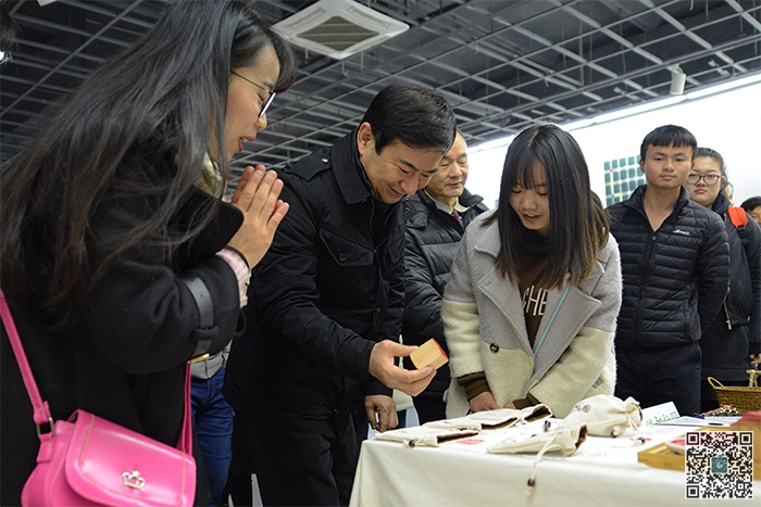 观展过程中,艺术设计学院师生向嘉宾介绍了相关专业和作品,并通过扫面二维码和亲手印制明信片的方式与嘉宾互动,在互动交流中得到了嘉宾的称赞和指导。