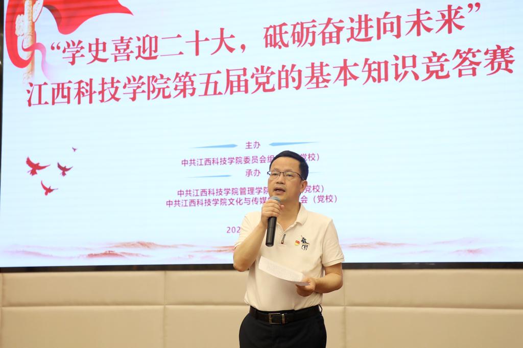 江科网讯(通讯员 魏芳 记者 何强江)6月10日,我校第五届“学史喜迎二十大砥砺奋进向未来”党的基本知识竞答赛决赛在行政南一楼第一会议室举行。学校党委书记邓弘出席活动并讲话。组织部、校(党)办、统战部、宣传部等部门负责同志,各学院党委书记、专职副书记、师生代表到场观赛。
