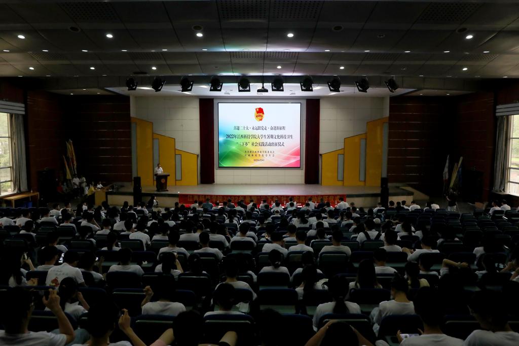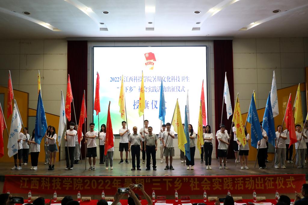 江科网讯(记者 何强江)6月20日下午,“喜迎二十大·永远跟党走·奋进新征程”江西科技学院2022年大学生暑期文化科技卫生”三下乡“社会实践活动出征仪式在报告A厅举行。校党委书记邓弘,校党委副书记、副校长闵桂林出席并为各队伍代表授旗。校团委相关负责同志,各学院党委书记、团委书记、兼职副书记,校学生会主席团成员,2022年暑期“三下乡”指导老师、学生志愿者参加仪式。