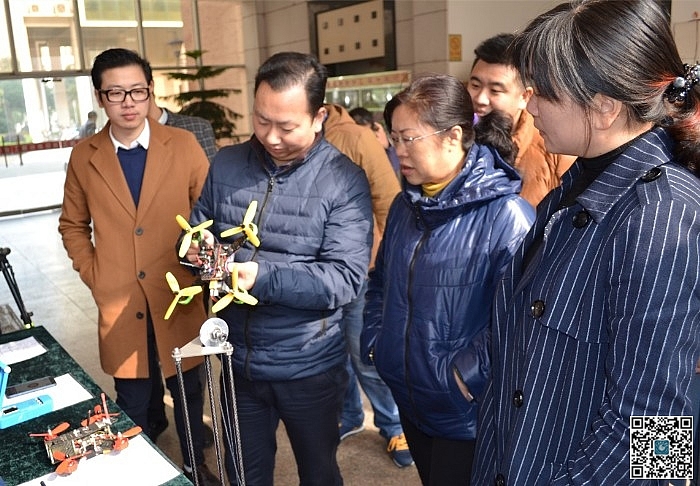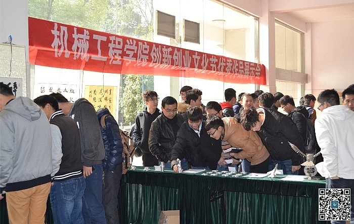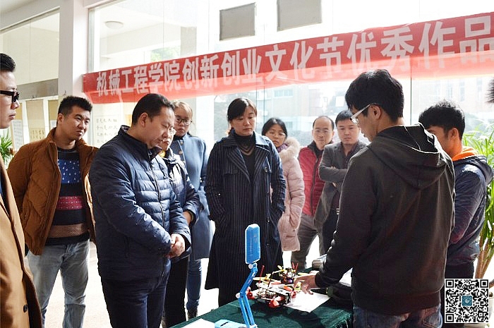 12月6日上午,机械工程学院在S2一楼大厅举行创新创业文化节优秀作品展。万哨凯、张海涛副校长在校团委负责人于海明、科研处副处长李玮和黄文敏、机械工程学院院长周青和副院长陈庆勤的陪同下参观了展览。