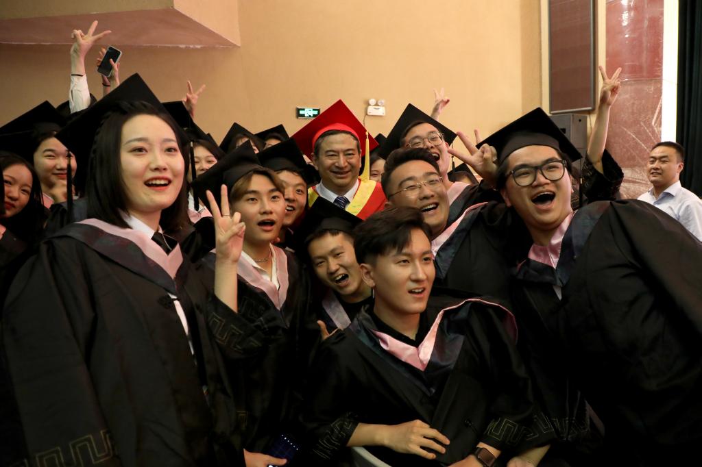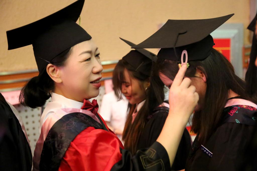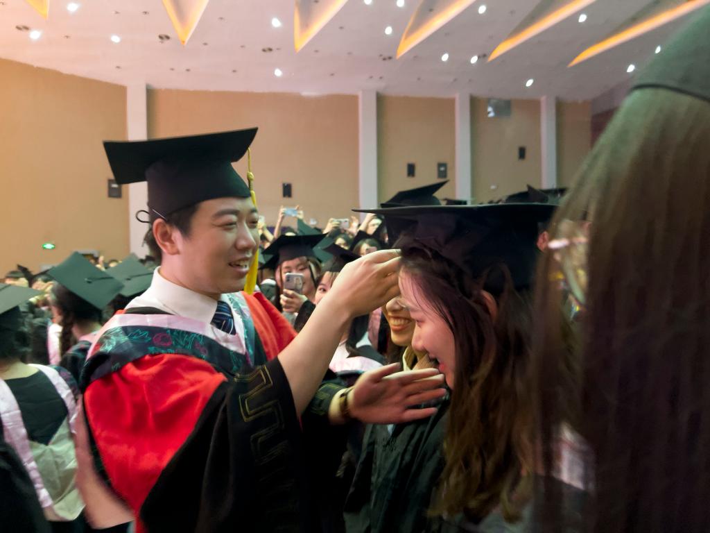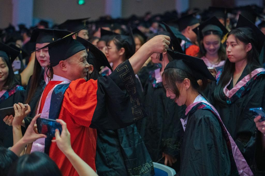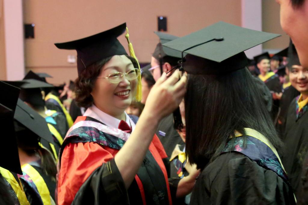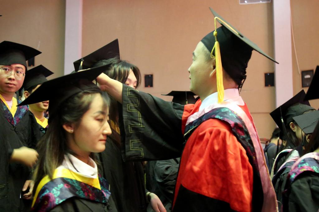 随后,在欢快的乐曲声中,校领导和学位委员们走到毕业生中间,将他们学士帽上的流苏从右到左轻轻地拨过,与同学亲切交谈,留下珍贵合影。