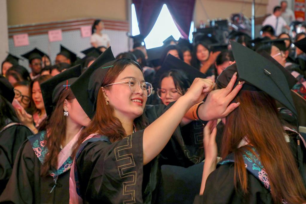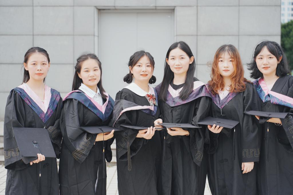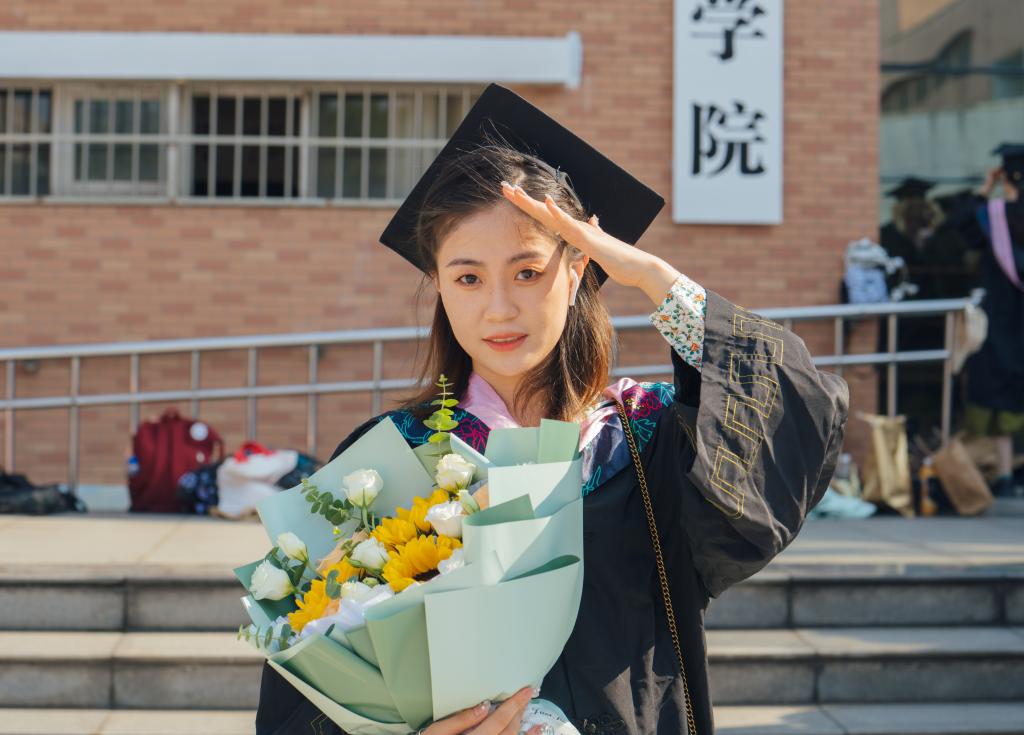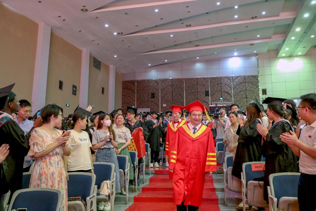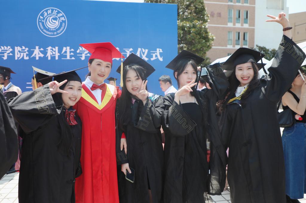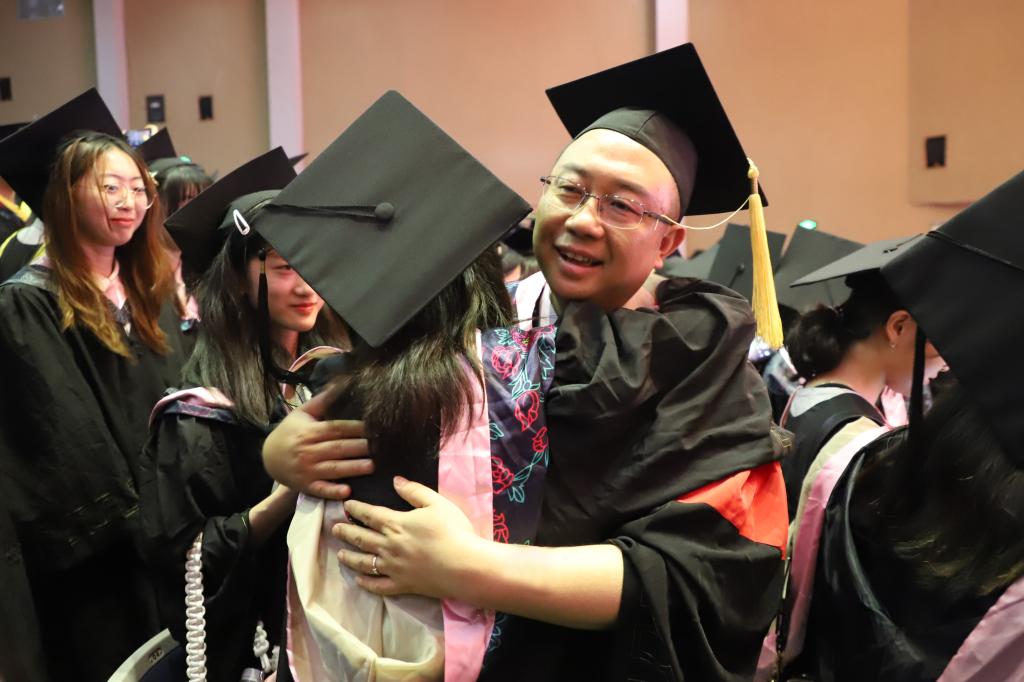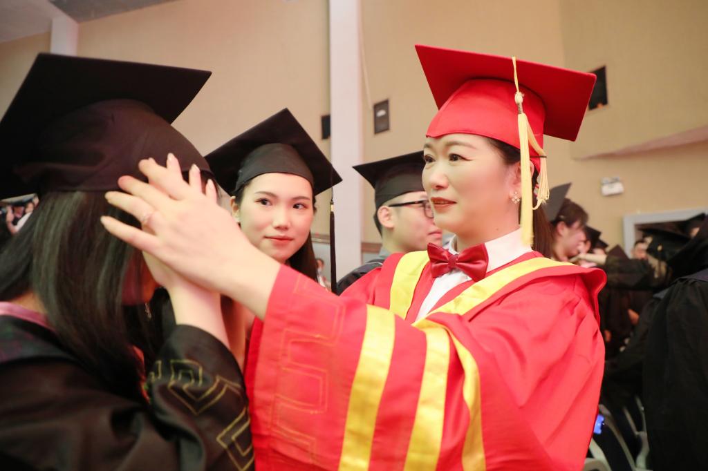 随后,在欢快的乐曲声中,校领导和学位委员们走到毕业生中间,将他们学士帽上的流苏从右到左轻轻地拨过,与同学亲切交谈,留下珍贵合影。