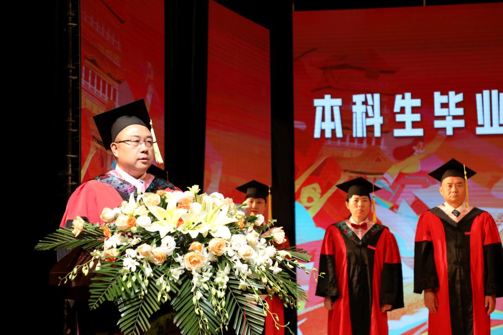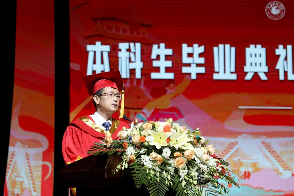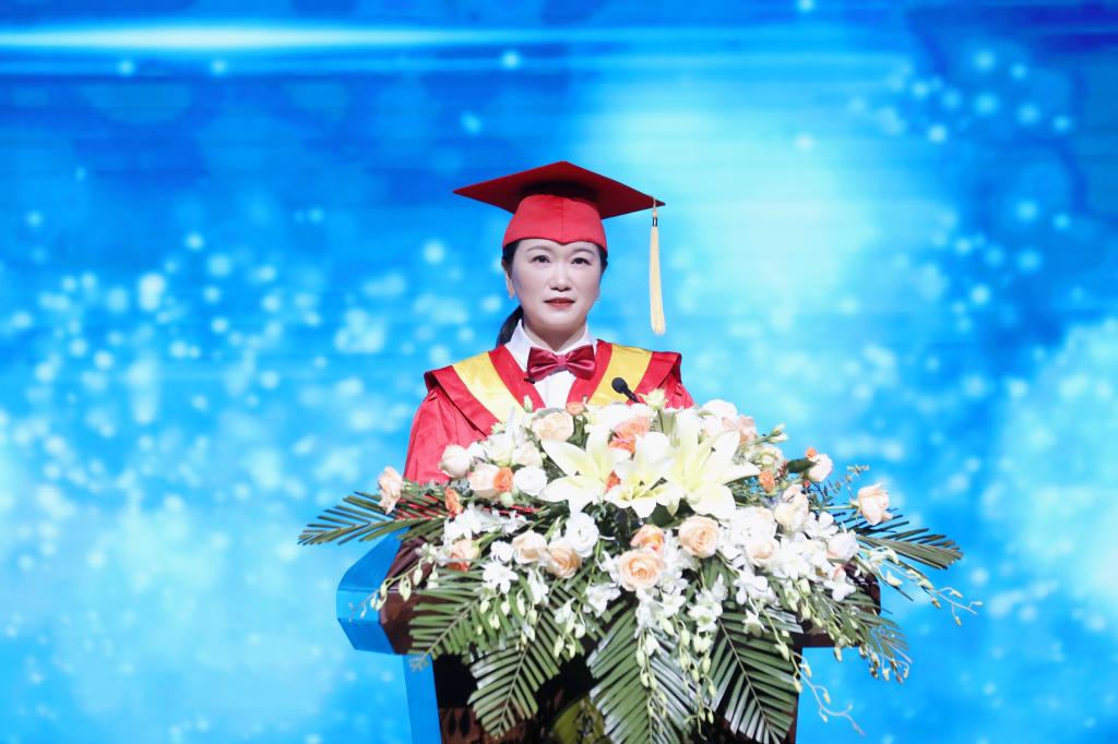 站在人生的新起点上,张海涛校长希望同学们牢记习近平总书记的殷殷嘱托,青春年华当奔赴大好河山,生逢盛世当创造锦绣前程。一是立大志,以理想之翼乘风远行。要立定远大志向,用心系家国的赤子之心化作不变的动力,用敢闯敢拼的昂扬斗志作为强劲的马力,以理想之翼在大时代的洪流中乘风远行。二是明大德,以奉献之翼翱翔万里。要修德处世,把报效祖国,奉献社会,服务人民作为未来的人生方向,以奉献之翼在大有可为的时代展翅翱翔。三是成大才,以创新之翼搏击长空。要以“创新”为内核,始终保持与时俱进、革故鼎新的创新品格,保持敢为人先、勇立潮头的创新精神,努力成为青年先锋、行业骨干,以创新之翼在大时代浪潮中搏击长空。四是担大任,以奋斗之翼驰骋天际。永葆“心中有信仰、肩上有担当、脚下有力量”的姿态,在奋斗中磨砺青春,在拼搏中锤炼意志,以奋斗之翼在大时代蓝图中驰骋天际。最后,她衷心祝愿2022届全体毕业生们在未来的人生之旅中一路向阳、恣意生长;一往无前,劈波斩浪;一生平安,幸福绵长。
