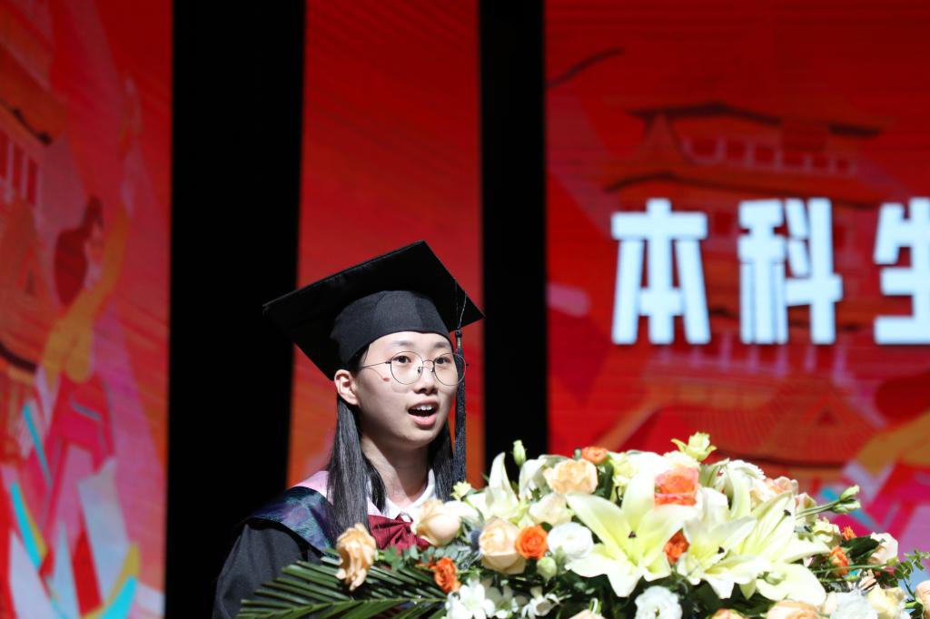 仪式上,艺术设计学院18本视觉传达设计6班的金巧同学作为毕业生代表上台发言。2022届毕业生带来的歌曲《后会无期》,让现场师生的内心交织着依依别情。齐唱《歌唱祖国》后,毕业生们在校领导和师长们的目送下,带着母校的嘱托与祝福履践致远。