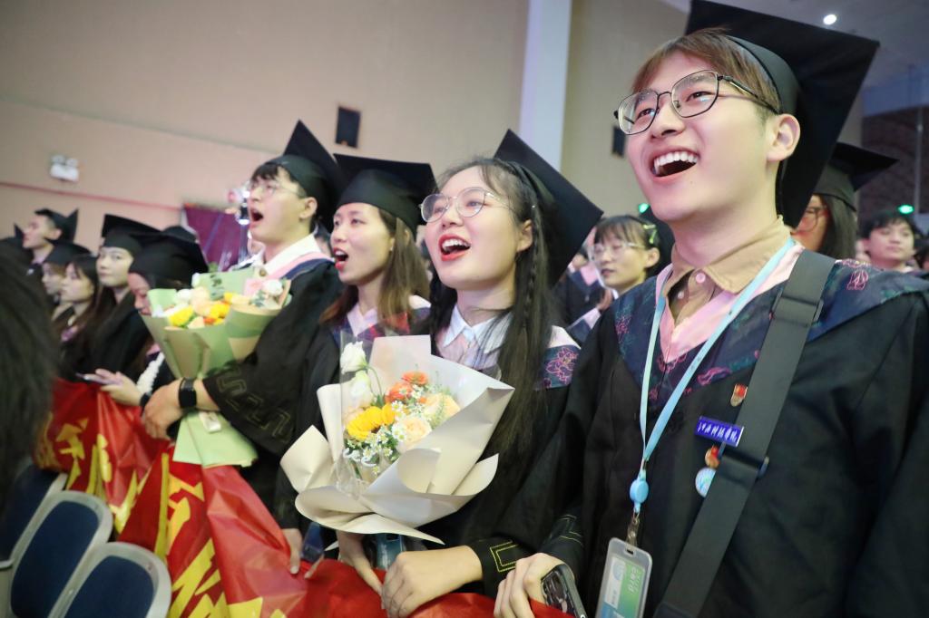 蓝海大剧场内,毕业生们共话青春、互道别情,气氛热烈;校歌《同一片蓝天》及毕业视频《别了,我的大学》勾起了大家的大学记忆,表达了不舍和期许。