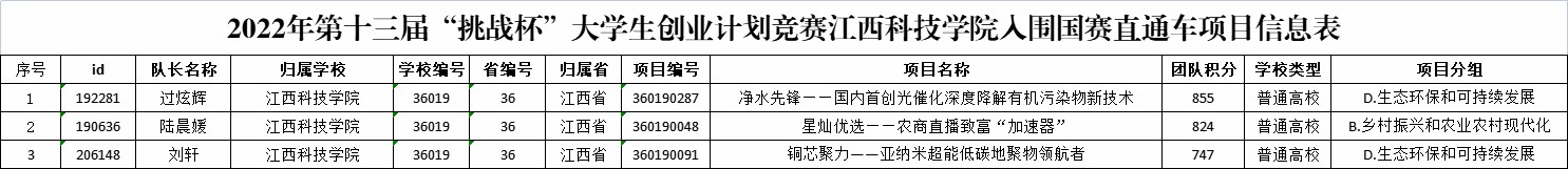 根据5月23日至6月18日各项目团队成员参与第十三届“挑战杯”国赛直通车系列活动获得个人得分核算团队积分,我校三个项目积分排名入围前1000名。入围国赛直通车项目评审(详见下表)。根据上级有关工作要求,现特此公示。公示时间为6月30日-7月5日,如有异议请与双创办联系。