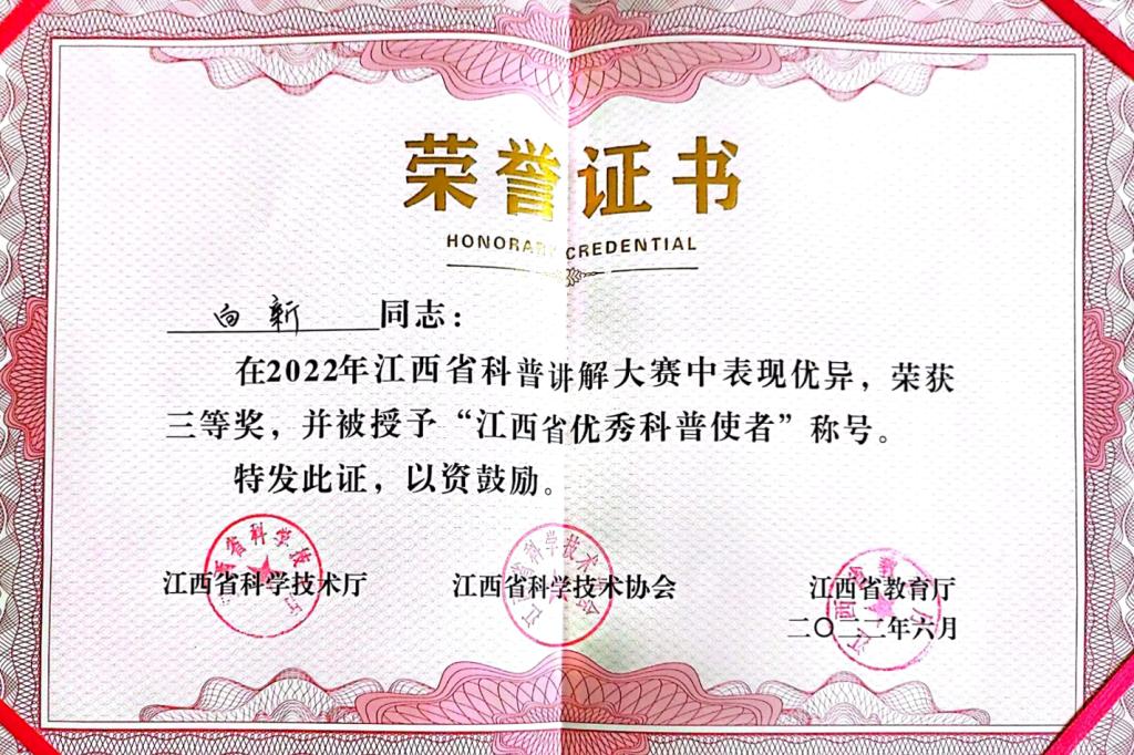 江科网讯(通讯员 徐萍)6月21日,由江西省科学技术厅、江西省科学技术协会、江西省教育厅主办的2022年江西省科普讲解大赛在江西省科学技术馆(江西省科学技术中心)举行。我校医学院20本护理1班白新同学代表学校参加该项赛事,并荣获三等奖和“江西省优秀科普使者”称号。学校荣获优秀组织奖。