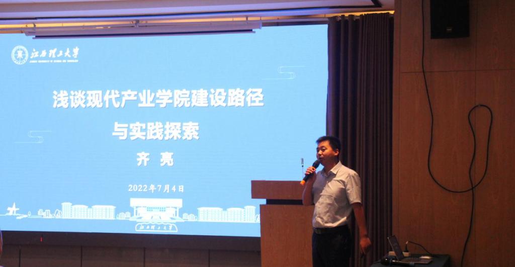会议邀请了江西理工大学教务处副处长齐亮作题为“浅谈现代产业学院建设路径与实践探索”的专题讲座。他从现代产业学院建设发展现状、现代产业学院建设的再思考及高校产业学院典型案例分析等三个方面进行了阐述,针对性地对现代产业学院建设工作中的痛点及发展现状进行了重点讲解。