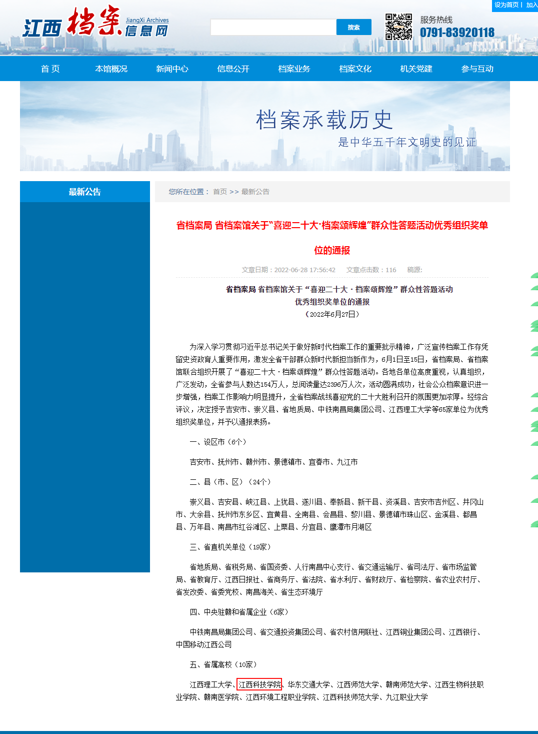 据悉,此次活动全省参与人数达154万人次,总阅读量2396万人次,108所高校参与,共有10所高校获得优秀组织奖。此次获奖是上级部门对我校档案工作的肯定。学校将再接再厉,以更加饱满的热情扎实做好档案工作,以优异的成绩迎接党的二十大胜利召开!
