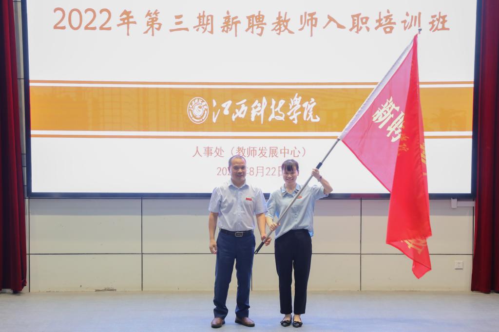 江科网讯(实习记者 梁俊颖)为帮助新聘教师尽快适应角色转换,胜任教育教学工作,8月22日至26日,我校教师发展中心举办以“凝心聚力 共创未来”为主题的2022年第三期新聘教师入职培训班。开班仪式于22日上午在报告B厅举行。副校长、工会主席林素君出席并讲话,校党委副书记、副校长闵桂林出席并为培训班授旗。