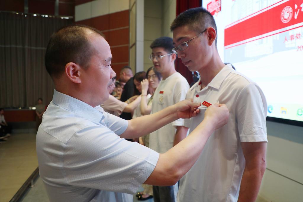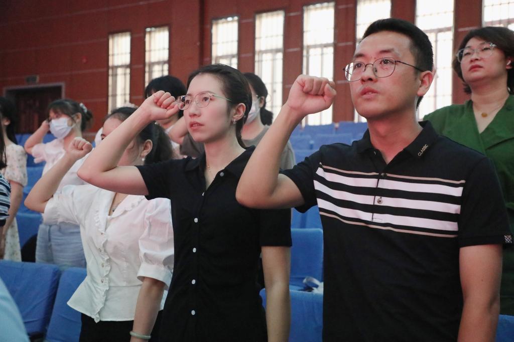 开班仪式上,外国语(国际教育)学院新聘教师李思睿作为学员代表发言。她表示,在今后的工作中,要以成为“大先生”为奋斗目标,严格要求自己,不断提高自己,将一腔热诚投入到工作中去,把一片爱心奉献给学生。随后,林素君副校长、闵桂林副校长与人事处、学工处、督导处等部门负责人共同为新聘教师代表佩戴校徽。全体学员举起右拳,面向国旗庄严宣誓。
