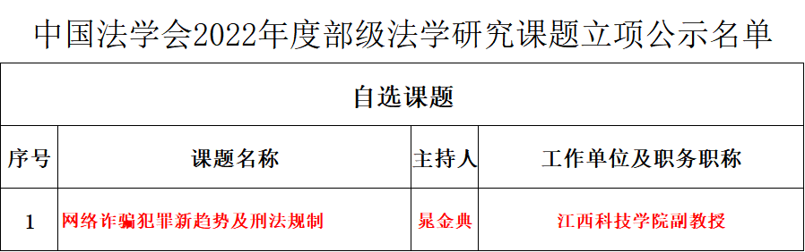 江科网讯(通讯员 李海艳)近日,中国法学会公布2022年度部级法学研究课题立项名单。我校习近平新时代中国特色社会主义思想研究中心晁金典副教授申报的《网络诈骗犯罪新趋势及刑法规制》获批立项。