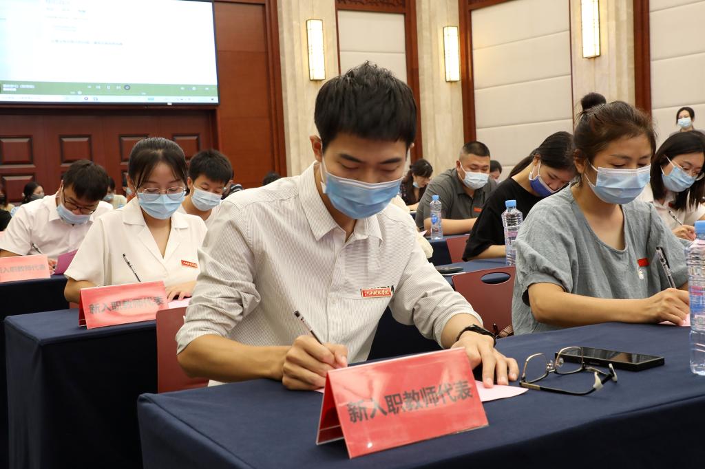 师德标兵代表、信息工程学院副院长金欢表示,今后将严于律己,以“德”立身,坚定政治信仰当好“举旗人”;内强素质,以“精”授业,笃定立德树人当好“铺路石”;真心真情,以“爱”育人,铆定本职岗位当好“知心人”。“在今后的工作中刻苦学习、虚心请教,不断提高自身素养,把对朋友的无私帮助、对学生的关怀爱护、对教育事业的不断追求,挥洒地淋漓尽致。”师德先进个人代表、音乐舞蹈学院学院教师李启星如是说到。新入职教师代表、财经学院教师王菁则表示,今后将牢记习近平总书记的嘱托,坚持为党育人、为国育才,为培养德智体美劳全面发展的社会主义建设者和接班人作出新时代教师应有的贡献。新入职教师在会上签订师德师风承诺书。