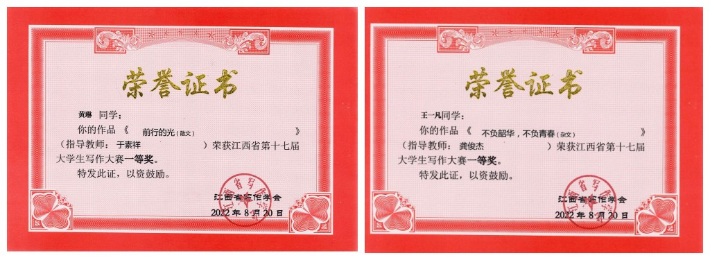 江西省写作大赛是有较大社会影响力的高校文科竞赛。文化与传媒学院积极响应学校向应用型高校转型的新思路和新探索,落实全方位人才培养、以赛促学的教育理念。此次取得的优异成绩,充分展现出我校学子的创新与实践能力,展示了新一代大学生的学识水平和精神风貌。