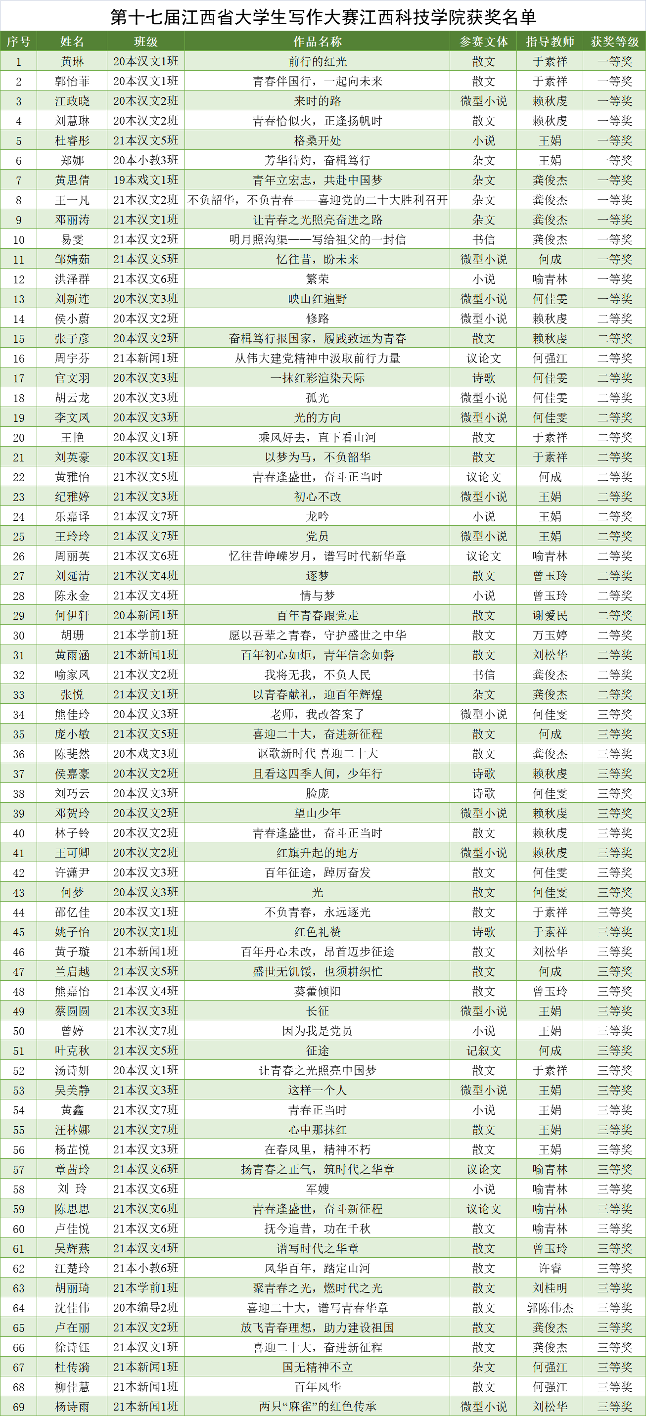江科网讯(通讯员 龚俊杰 记者 何强江)日前,由江西省写作学会举办的江西省第十七届大学生写作大赛圆满落幕。来自省内外各大高校的千余篇作品参与角逐,经评审组专家审定,我校共有69篇参赛作品获奖,其中一等奖13篇、二等奖20篇、三等奖36篇。