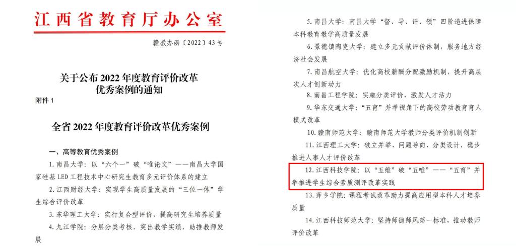 江科网讯(通讯员 程怡)近日,江西省教育厅公布2022年度全省教育评价改革优秀案例,我校报送的改革案例《以“五维”破“五唯”——“五育并举”推进学生综合素质测评改革实践》成功入选,全省高校入选案例共有14个。