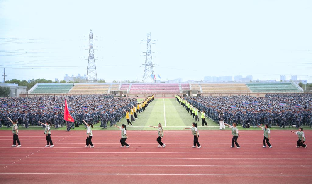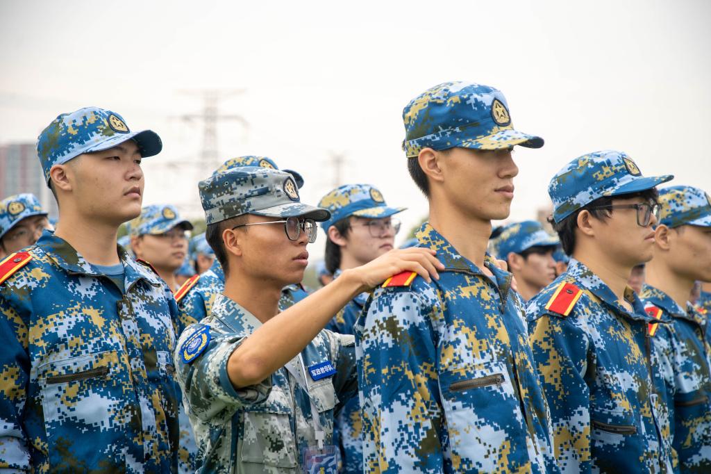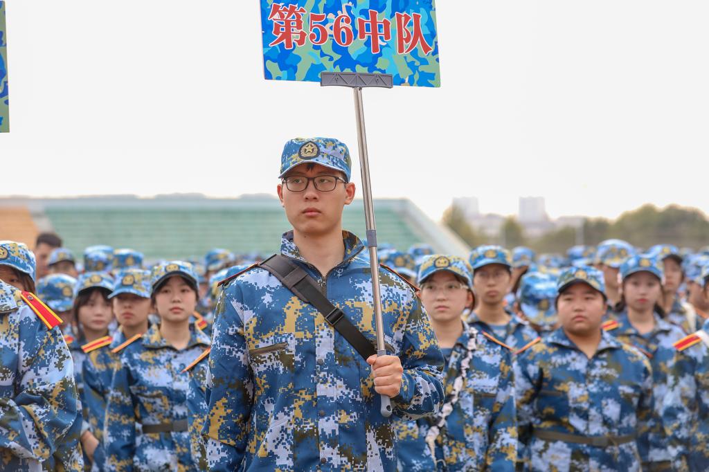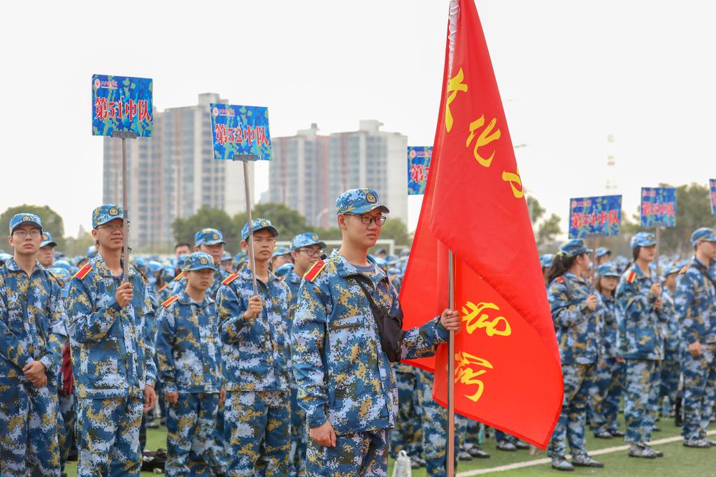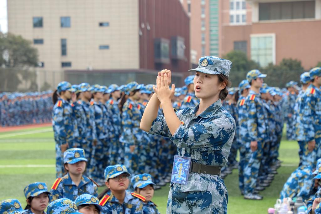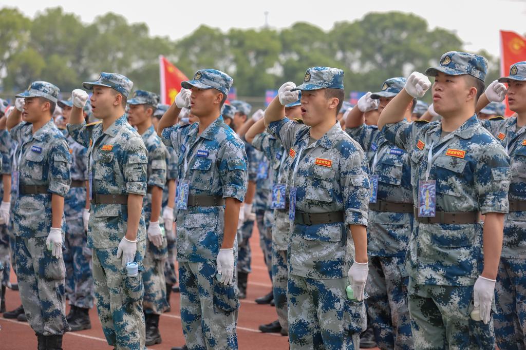动员大会上,学长学姐代表向全体2022级本科新生致欢迎辞,全体军训教官进行带训宣誓并进行中队教官分配,现场师生齐唱校歌《同一片蓝天》。会后,为期两周的军训正式开始。(图 / 宣传部 学工处 见微知著大学生网络文化工作室)