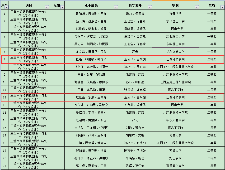 江科网讯(通讯员 王新飞 张伟伟)日前,2022年第十五届全国大学生结构设计竞赛分区赛(江西)圆满落下帷幕。经过激烈角逐,我校两支参赛队伍成绩均获得省赛二等奖,创造了我校自参加该项竞赛以来的最好成绩,实现新突破。