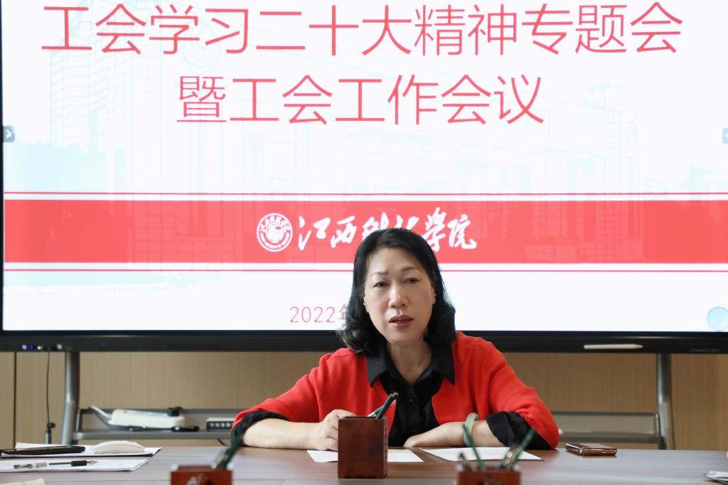 江科网讯(记者 何强江)11月8日下午,校工会在职工之家党员活动室召开学习党的二十大精神专题会暨工作会议。副校长、工会主席林素君出席。校工会办公室全体成员、各分工会主席参加会议。