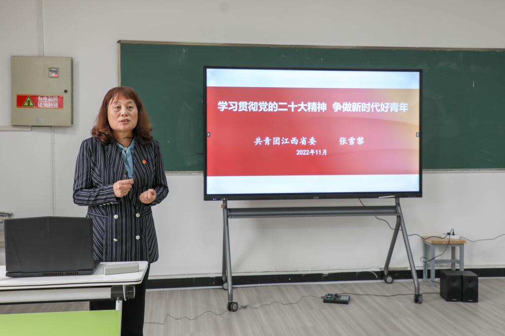 活动中,张雪黎向同学们作题为《学习贯彻党的二十大精神争作新时代好青年》的宣讲报告。她从“深刻认识学习贯彻党的二十大精神的重大意义”“全面准确领会党的二十大精神实质”“深刻领悟党对青年工作的殷切期望”以及“深刻领悟党的二十大精神争做新时代好青年”四个方面,对党的二十大精神进行全面、深入、系统的解读。她强调,党的二十大报告对广大青年提出了“立志做有理想、敢担当、能吃苦、肯奋斗的新时代好青年”的期望和要求,广大青年学子要认真学习、深刻领会,坚定不移听党话、跟党走,将青春融入党和人民的事业,在新征程上更好肩负起历史使命和时代责任。