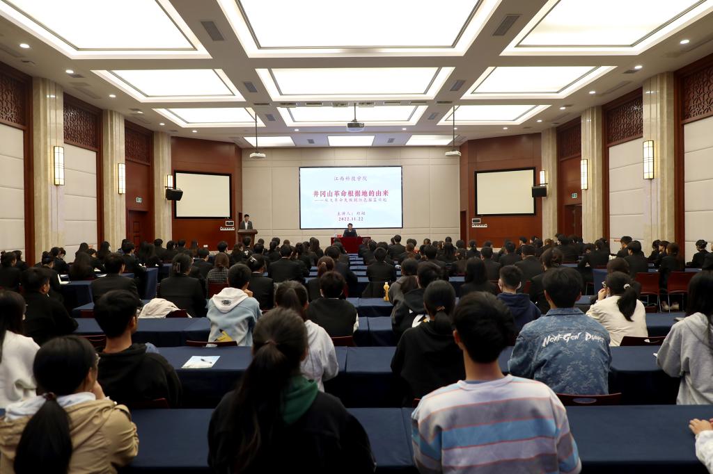 江科网讯(记者 何强江)11月22日,迎来了二十四节气中的小雪,也迎来了省文联原党组书记、省文史研究馆馆员郑翔先生带来的一场“红色之源,摇篮之始”主题红色讲座。这既是一堂生动的学者分享交流,又是一节追溯井冈山革命根据地由来的生动党史课,更是一次学习贯彻党的二十大精神的高质量辅导。省商务厅原厅长杨洪基、董事长于果、校党委书记邓弘、副校长陈石俊现场聆听。