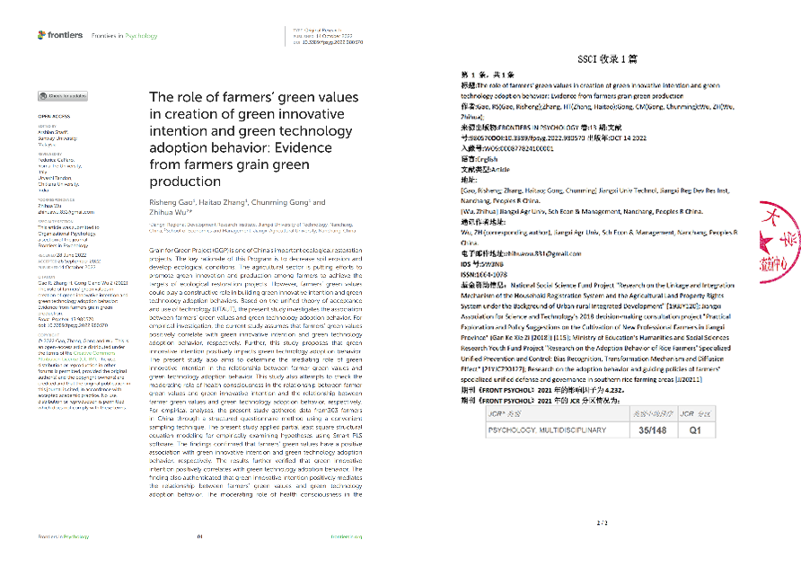 江科网讯(通讯员 曾丽英)近日,我校青年教师高日升以第一作者在SSCI收录期刊《FRONTIERS IN PSYCHOLOGY》的Organizational Psychology栏目发表论文《The role of farmers’ green values in creation of green innovative intention and green technology adoption behavior: Evidence from farmers grain green production》。