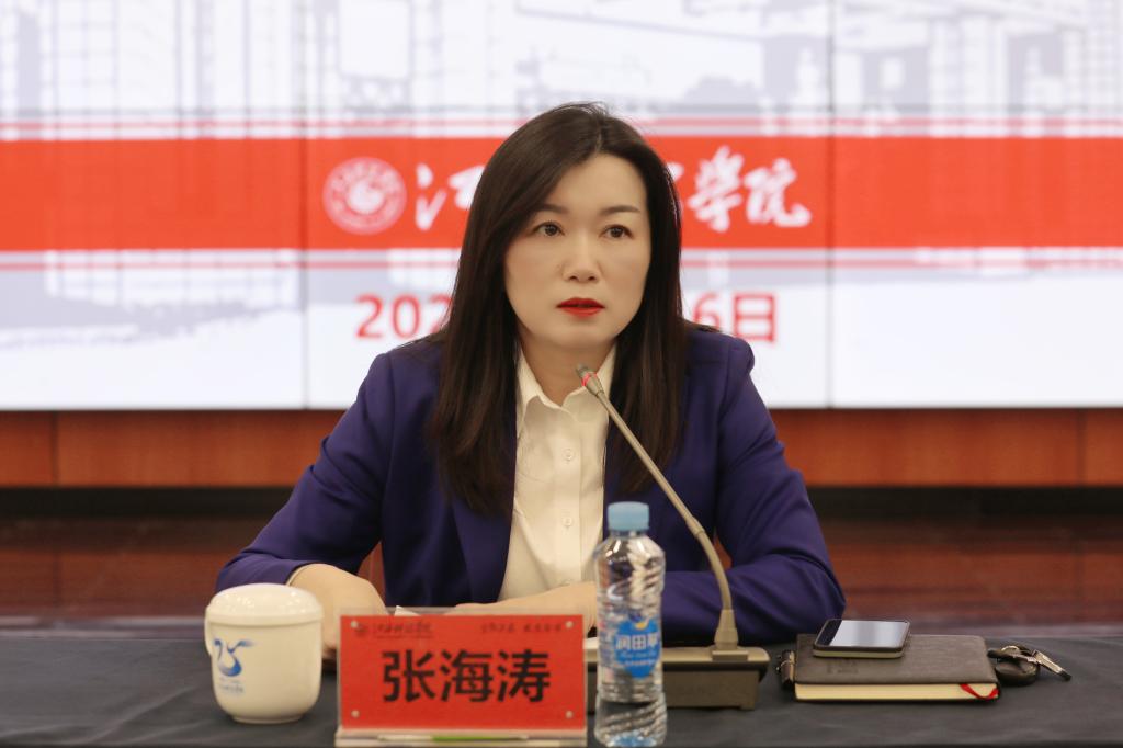 张海涛校长就基地建设及项目申报工作进行部署。她指出,管理科学研究基地申报竞争大、含金量高,我校成功获批江西省数字经济与产业创新发展研究基地,体现了省科学技术厅对我校科研能力的肯定与信任。接下来要把基地建设、项目建设工作作为重中之重来抓;要扎扎实实将平台建设好,依托平台支撑,实现学校管理学科、科研力量的跨越式发展;要以本次会议为契机,统一思想,就如何进行项目申报、人员配置、任务分配等达成共识;要明确项目牵头单位、牵头人,统筹各方科研优势力量进行项目申报与相关研究,充分发挥研究基地决策咨询作用,助推江西省创新型省份建设与高质量发展。
