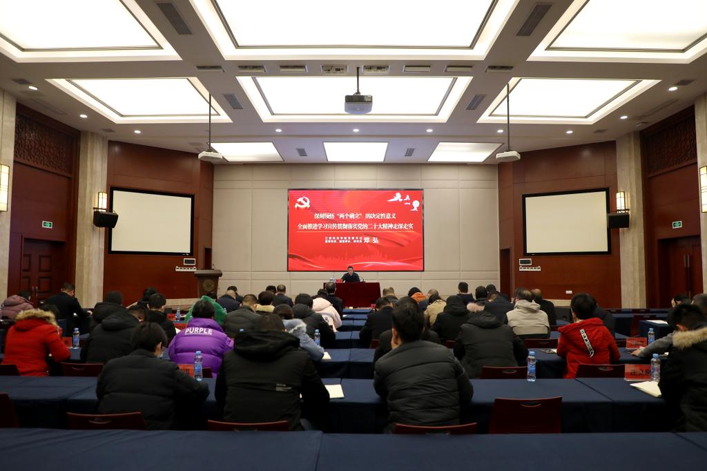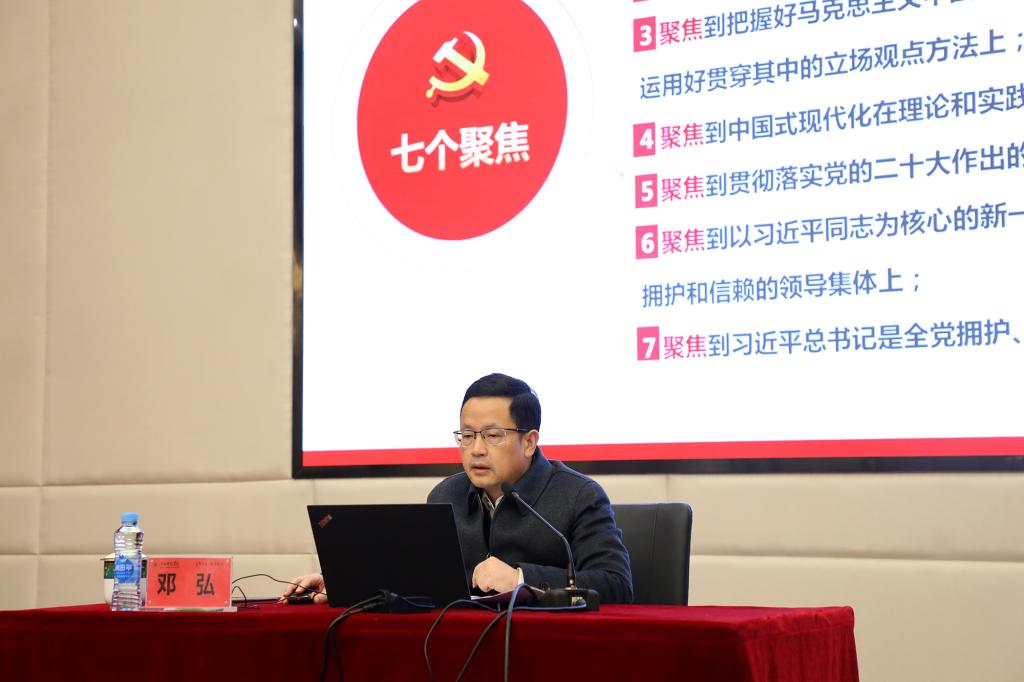 邓弘书记以“深刻领悟‘两个确立’的决定性意义 全面推进学习宣传贯彻落实党的二十大精神走深走实”为主题展开宣讲。他指出,《中共中央关于认真学习宣传贯彻党的二十大精神的决定》深刻阐述了学习宣传贯彻党的二十大精神的重大意义,用“九个深刻领会”鲜明指出了学习领会党的二十大精神需要着重把握的方面,用“七个聚焦”明确提出了学习宣传党的二十大精神的着力点,对学习宣传、贯彻落实党的二十大精神作出全面部署、提出重要要求,为我们进一步全面、系统、深入学习,切实用党的二十大精神武装头脑、指导实践、推动工作提供了根本遵循。